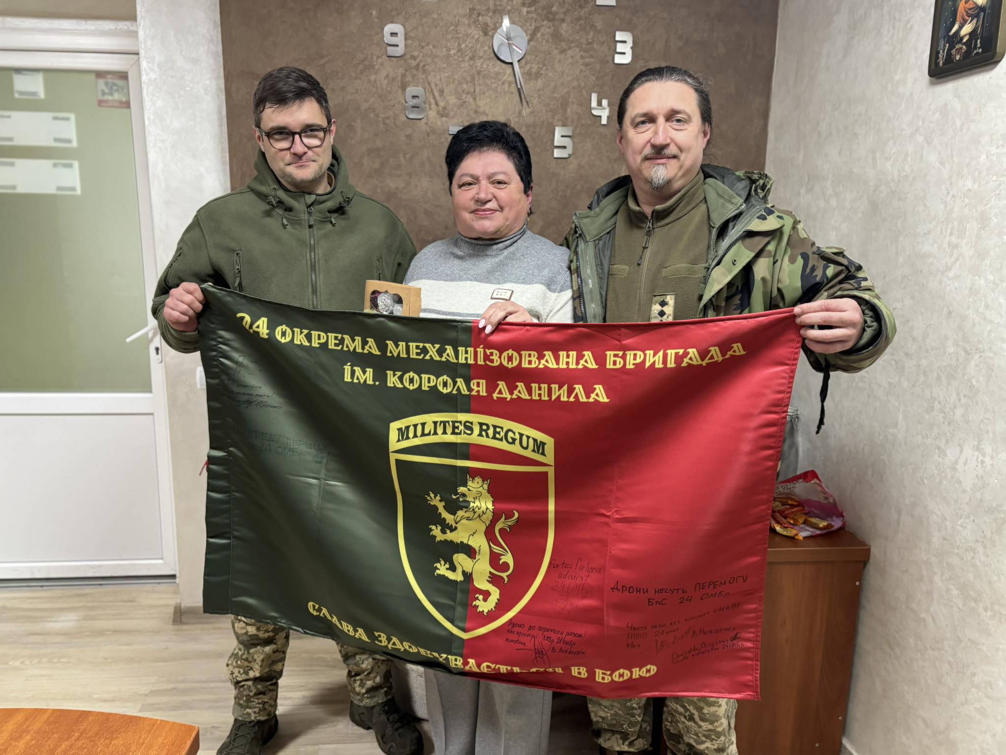 Від особового складу військової частини А0998 (24 окрема механізована бригада ім. Короля Данила), представники якої сьогодні відвідали нашу громаду, вручено Подяку та стяг з підписами військовослужбовців за постійну фінансову та матеріальну допомогу Збройним Силам України, адже протягом 2025 року з бюджету Ралівської сільської ради спрямовано кошти в сумі 500 000 грн💰 для потреб частини.
