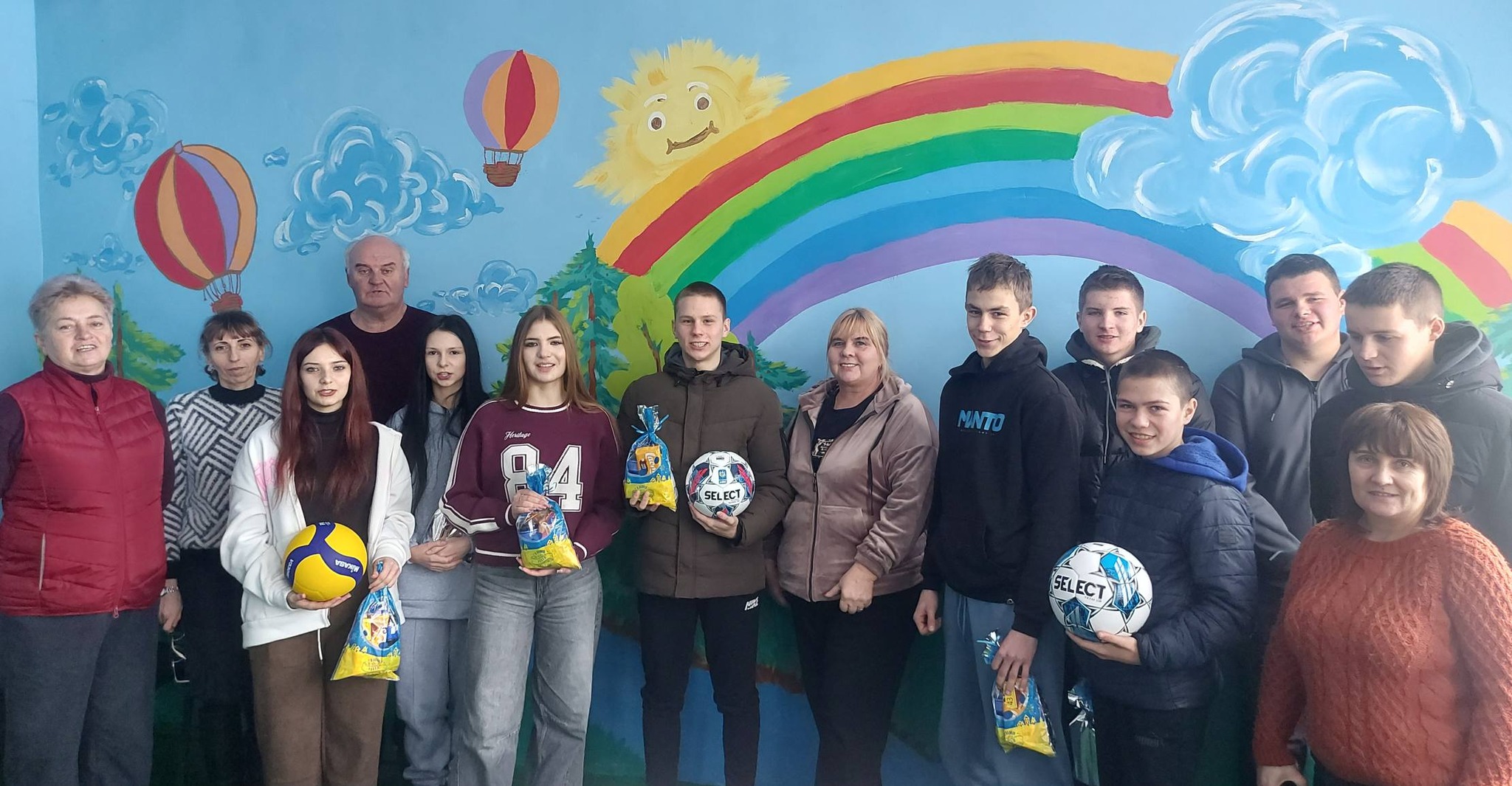 Людмила Іванівна вручила всім присутнім новорічні подарунки, надані нашими меценатами Юрієм та Людмилою Балущак, також подарували громаді футбольні м’ячі.