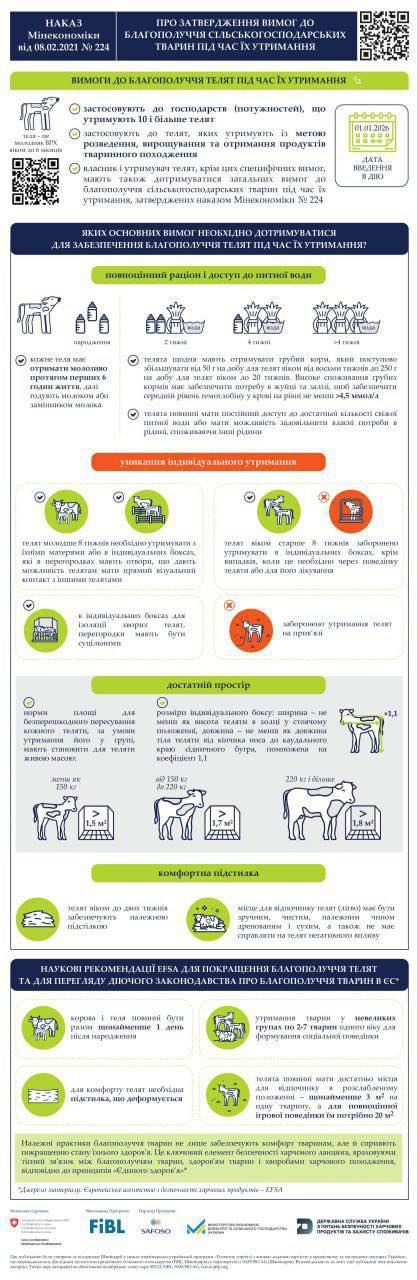За підтримки Швейцарії, в межах швейцарсько-української програми «Розвиток торгівлі з вищою доданою вартістю в органічному та молочному секторах України» (Quality FOOD Trade Program), що впроваджується Дослідним інститутом органічного сільського господарства (FiBL,Швейцарія) у партнерстві з SAFOSO AG (Швейцарія), Міністерством економіки, довкілля та сільського господарства України та Держпродспоживслужби створено інфографіку, в якій висвітлені вимоги до благополуччя телят під час їх утримання.