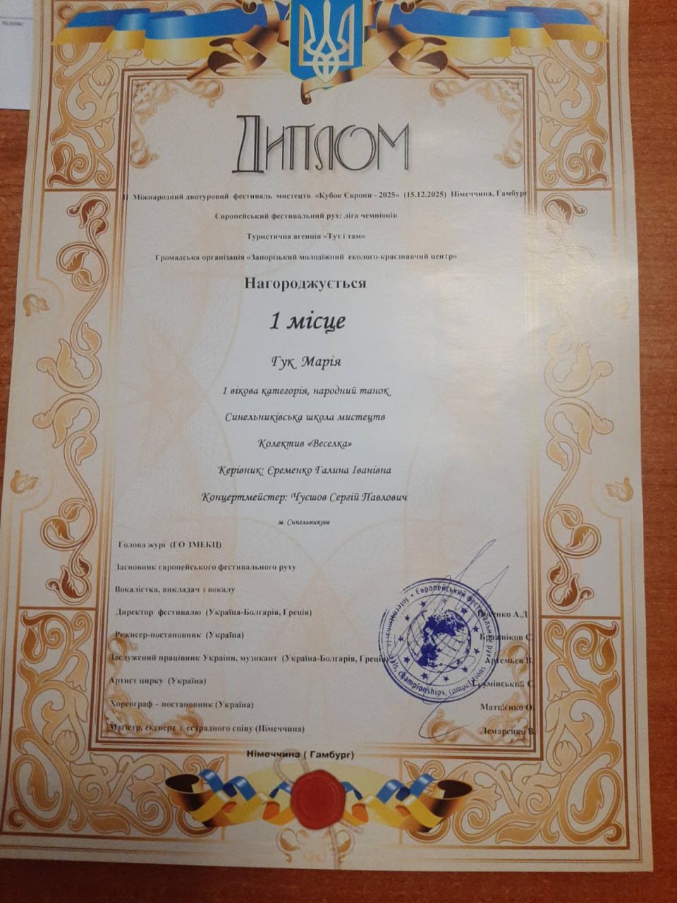 💐 15 грудня 2025 року солістка колективу «Веселка» Гук Марія взяла участь (онлайн) у ІІ Міжнародному двотуровому фестивалі мистецтв «Кубок Європи-2025» (м.Гамбург-Німеччина) та посіла І місце.