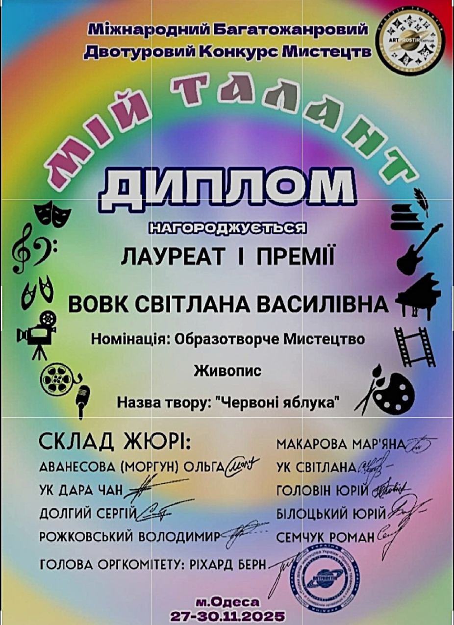 💐 27 листопада 2025 року викладач класу образотворчого мистецтва Вовк Світлана Василівна взяла участь (онлайн) у Міжнародному багатожанровому двотуровому конкурсі мистецтв «Мій талант» (м.Одеса) та стала лауреатом І премії.