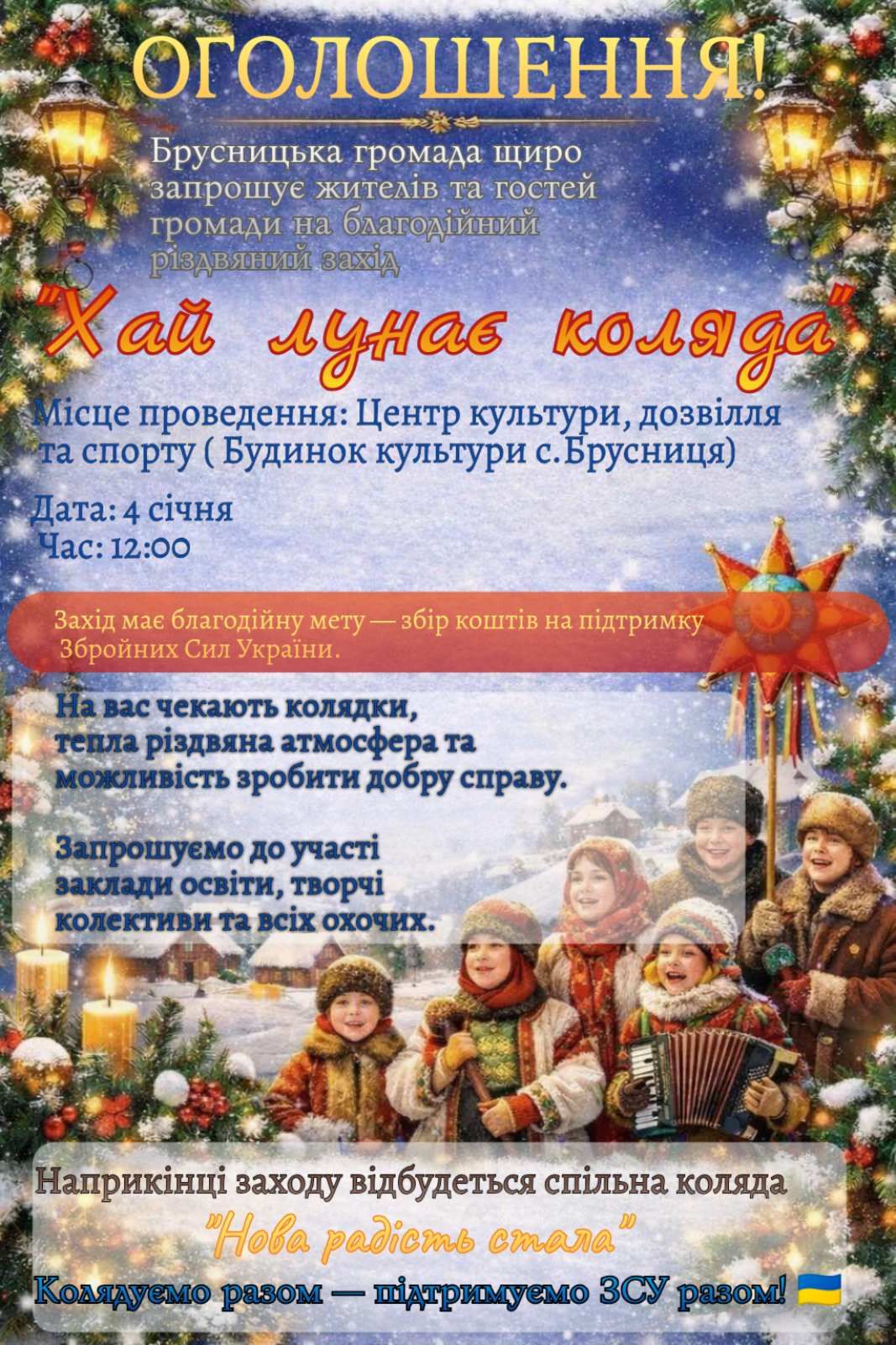 Брусницька громада щиро запрошує жителів та гостей громади на благодійний різдвяний захід