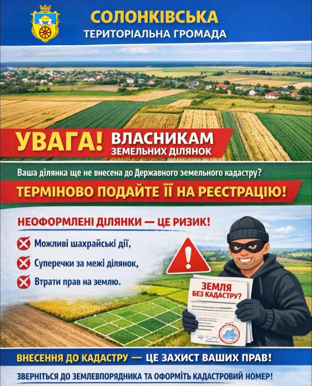 ОГОЛОШЕННЯ ДЛЯ ВЛАСНИКІВ ЗЕМЕЛЬНИХ ДІЛЯНОК Шановні мешканці Солонківська терито…