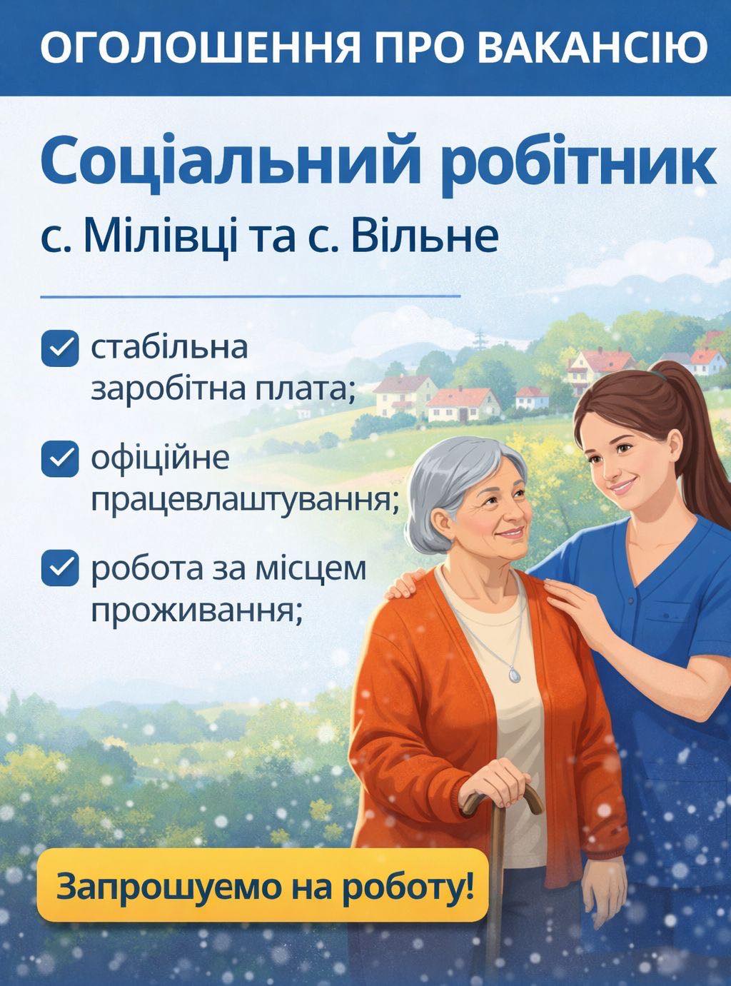 Запрошуємо на роботу соціального робітника( с. Мілівці, с. Вільне)