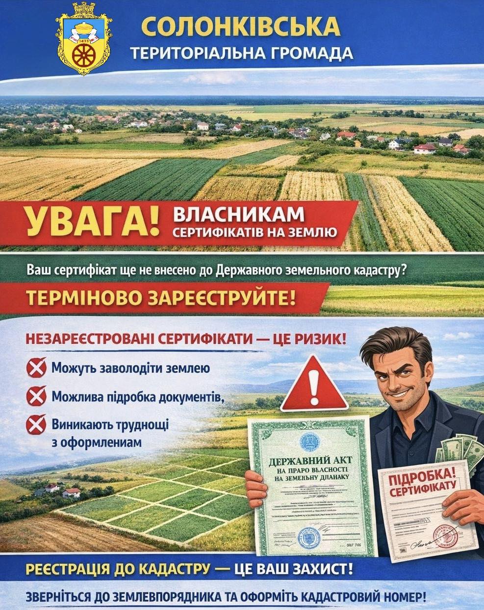 Солонківська територіальна громада звертається до власників сертифікатів на право на земельну частку (пай), які досі не сформували земельну ділянку та не внесли її до Державного земельного кадастру.