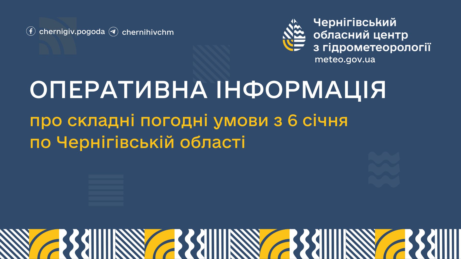 У зв’язку з переміщенням циклону з південного заходу та проходженням атмосферних фронтів через територію Чернігівської області, починаючи з 6 січня очікуються складні погодні умови: пройдуть опади, місцями значні опади, у вигляді снігу, мокрого снігу та дощу, місцями: ожеледь, налипання мокрого снігу, посилення вітру до 15-20 м/с. На дорогах буде зберігатися ожеледиця.