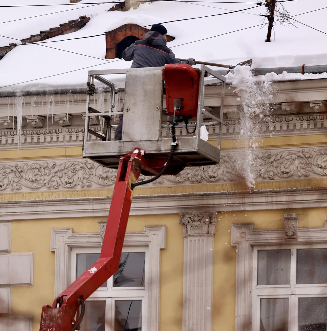 На дахах утворилося багато обледеніння та бурульок. Наші комунальники з ночі їх прибирають, зчищають небезпечні нависи та посипають тротуари, бо доріжки теж сильно примерзли.