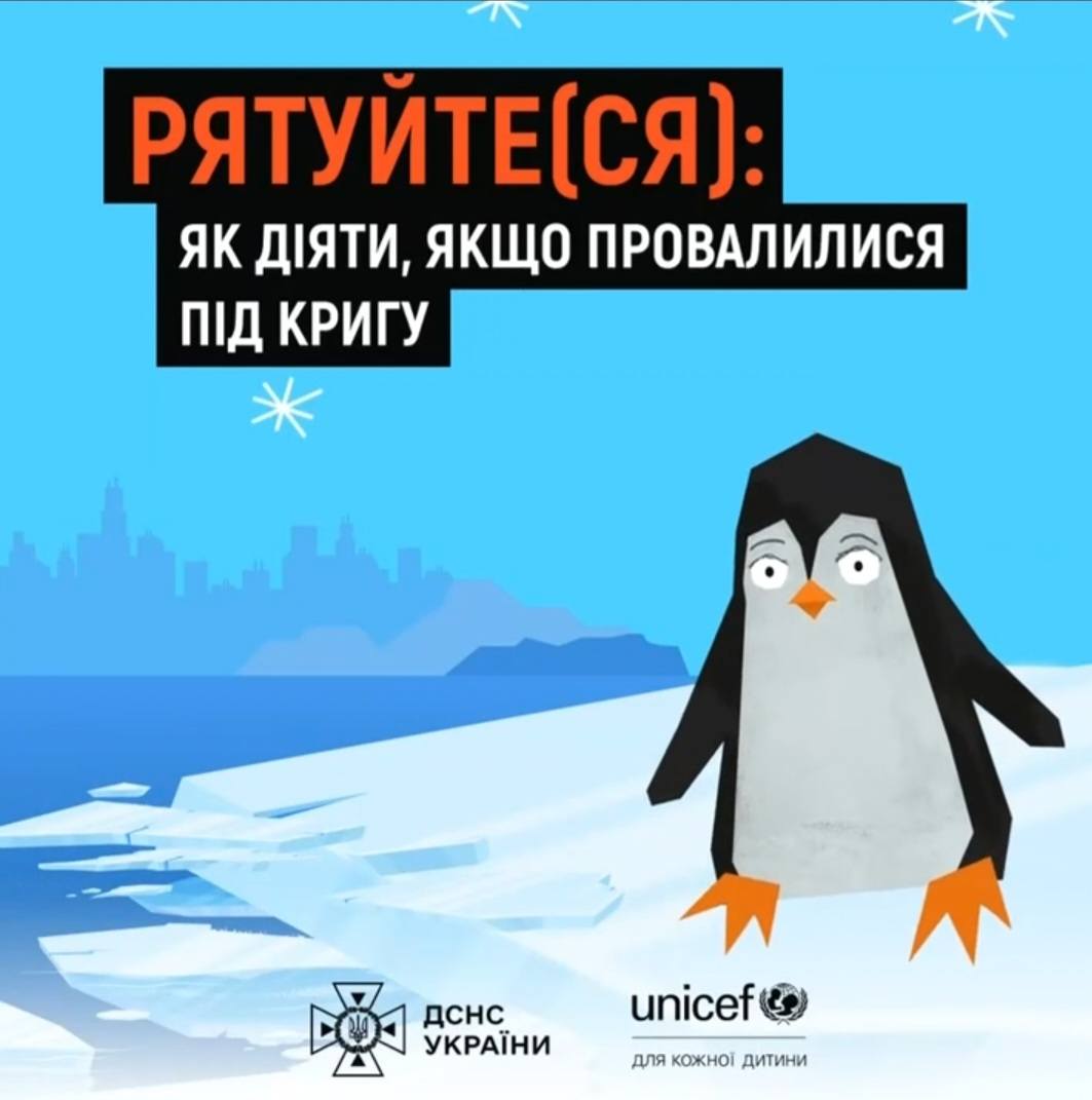 📢 ДСНС України спільно з UNICEF Ukraine закликають: не випробовуйте міцність льоду. Краще заздалегідь оминути небезпеку, ніж опинитися у крижаній воді, де кожна секунда може стати вирішальною.