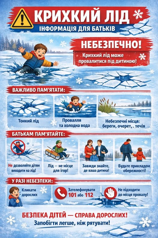 ❄️ Кілька морозних днів не гарантують безпечної товщини льоду на водоймах. Навіть якщо поверхня здається міцною, крига може бути нерівномірною та мати приховані небезпечні ділянки.