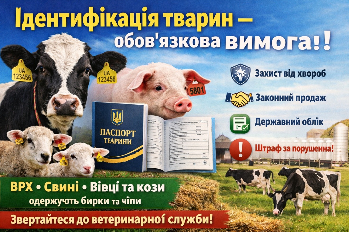 ❗ Без ідентифікації тварин не можна законно продавати, перевозити чи забивати, а також передбачена адміністративна відповідальність.