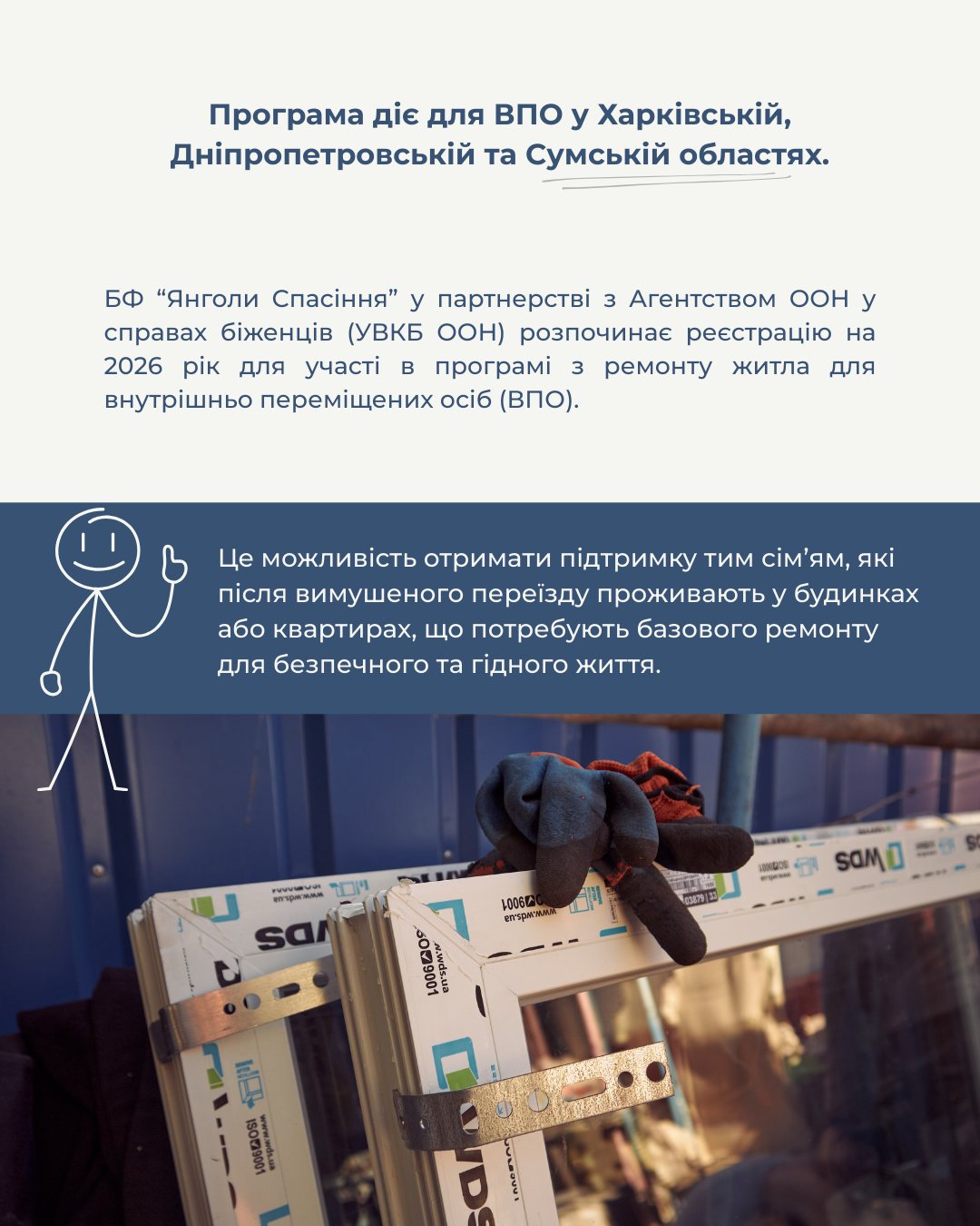 Благодійний фонд **«Янголи Спасіння»** спільно з **Агентством ООН у справах біженців в Україні (УВКБ ООН)** розпочинає **реєстрацію на 2026 рік** для участі у програмі з **ремонту житла для внутрішньо переміщених осіб (ВПО)**.