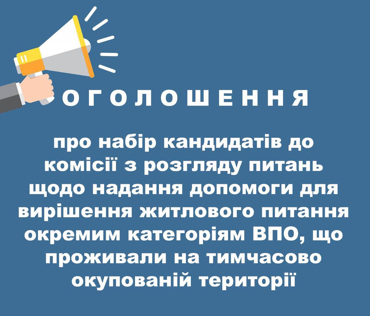 Оголошення про набір кандидатів до комісії з розгляду питань щодо надання допомоги для вирішення житлового питання окремим категоріям ВПО, що проживали на тимчасово окупованій території