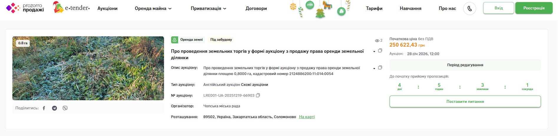 Із метою реалізації рішення 60 сесії VIIІ скликання Чопської міської ради від 28 серпня 2025 року №37 «Про проведення земельних торгів у формі аукціону з продажу права оренди земельної ділянки» на сайті https://auction.e-tender.ua/ оприлюднено лот для земельних торгів в електронній торговій системі: