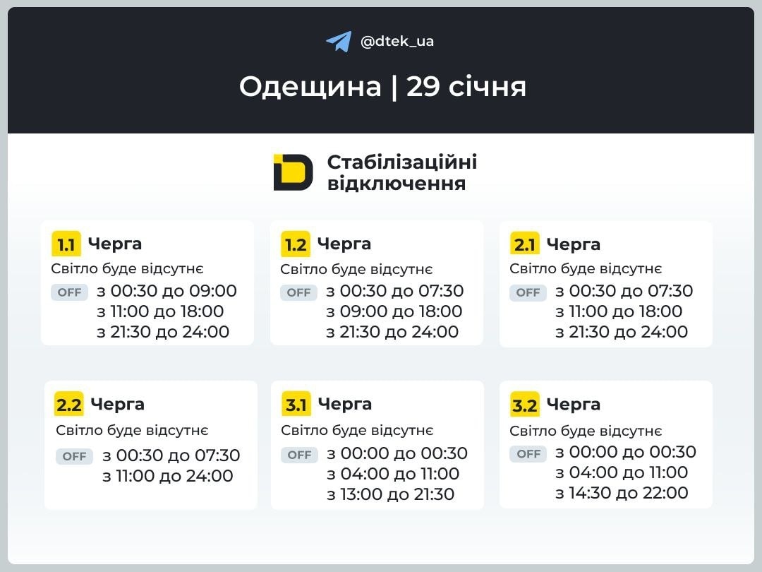 ‼️Одещина: графіки відключень на 29 січня