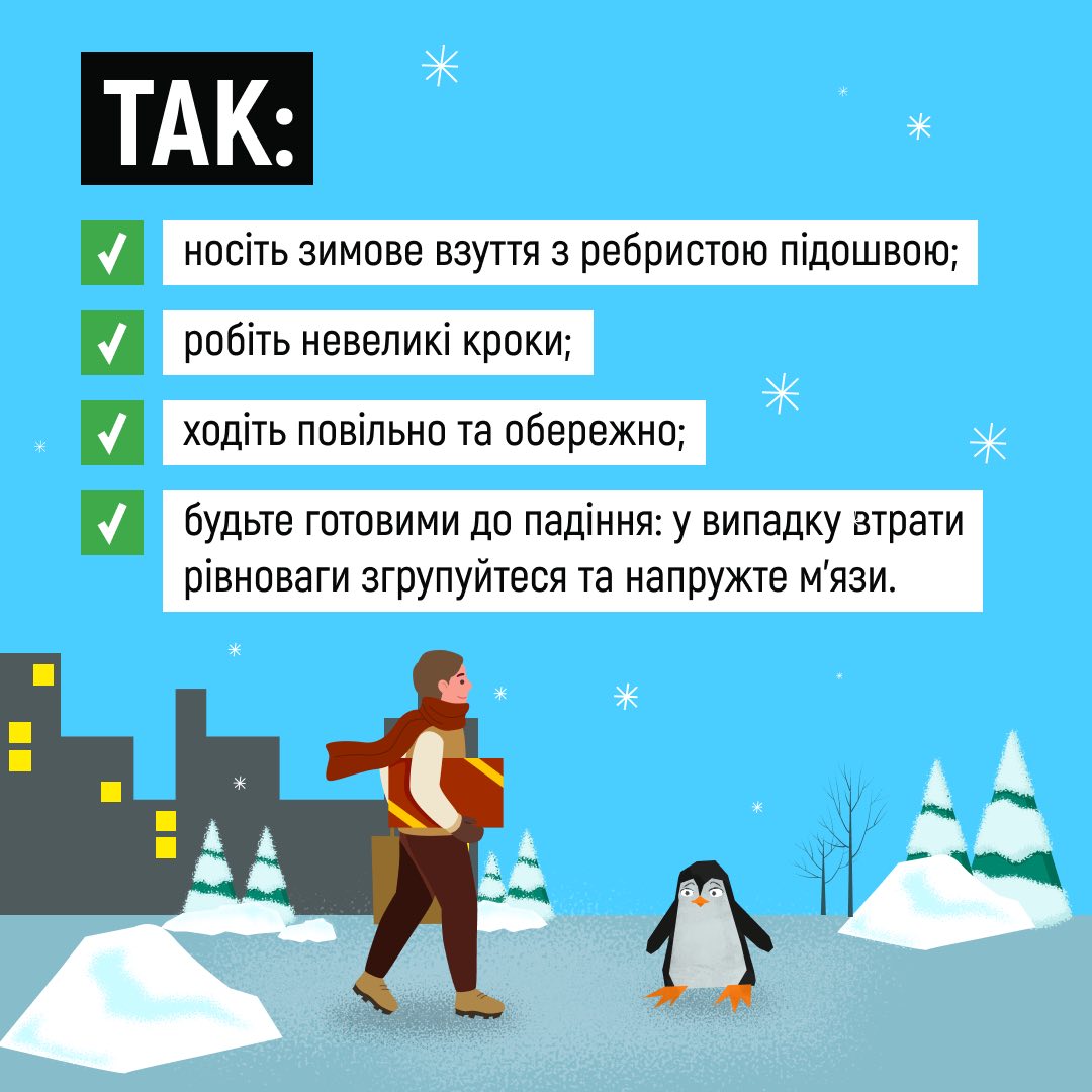 Ожеледиця🌨️⛸️ — не привід залишатися вдома. Дотримуйтеся простих правил поведінки на замерзлих дорогах, щоб знизити ризик травмування!
