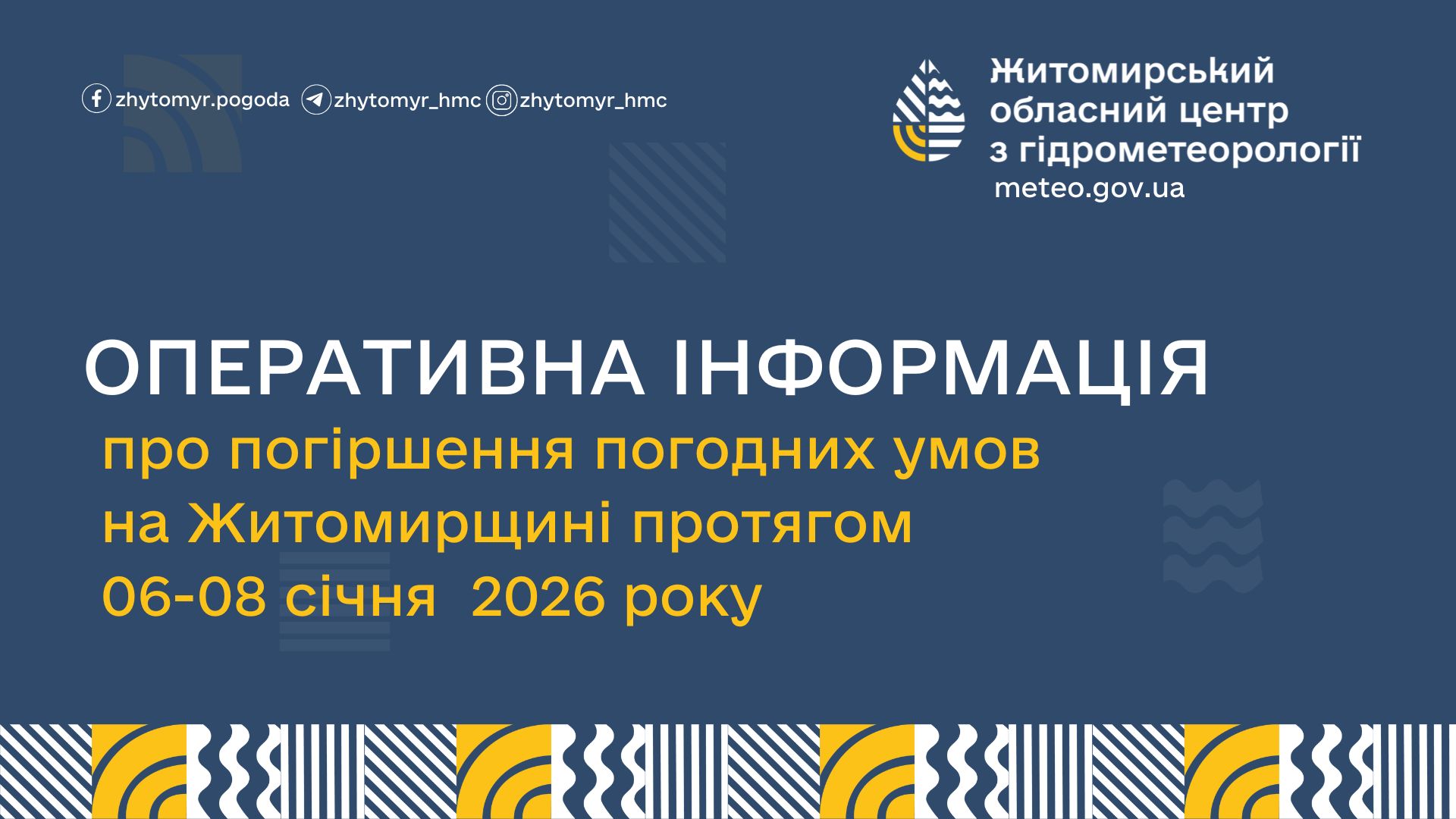 📌📝У зв’язку з переміщенням на територію України південного циклону та серії атмосферних фронтів, протягом 6-8 січня 2026 року на Житомирщині очікується погіршення погодних умов: