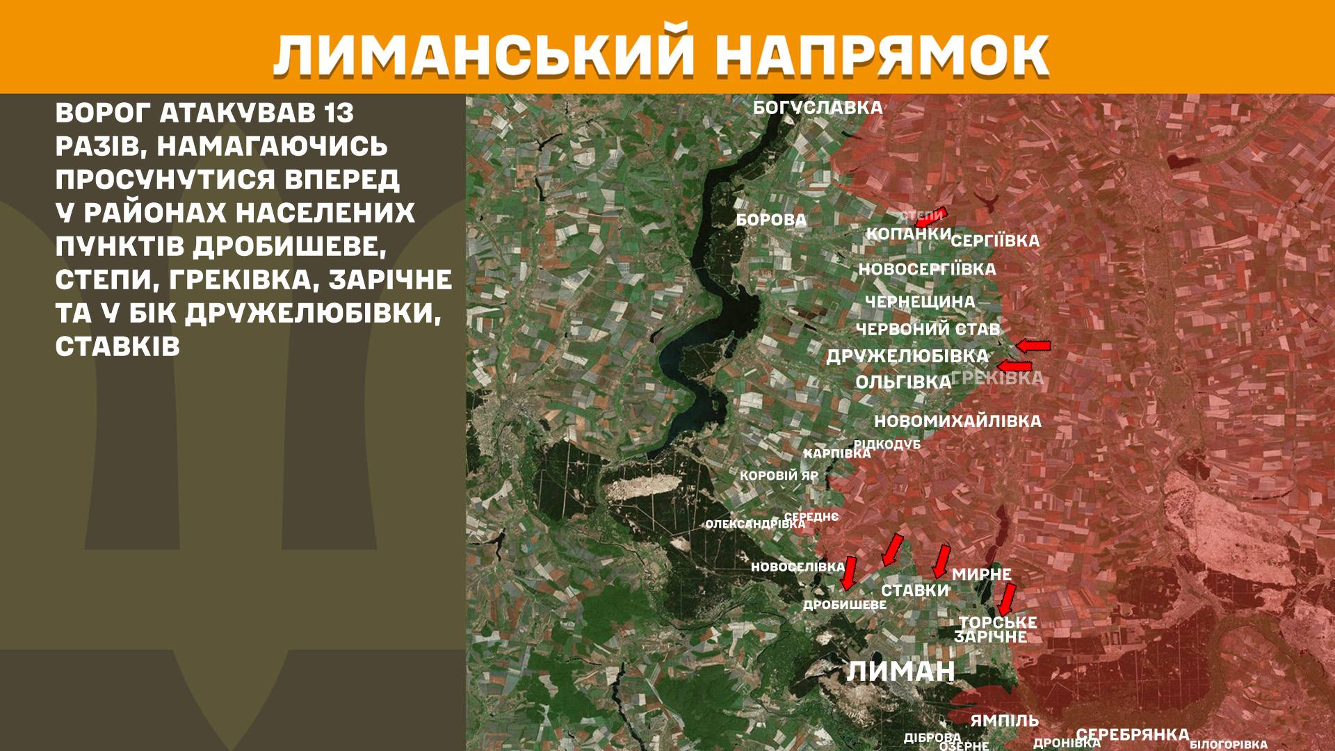 На Лиманському напрямку ворог атакував 13 разів, намагаючись просунутися вперед у районах населених пунктів Дробишеве, Степи, Греківка, Зарічне та у бік Дружелюбівки, Ставків.