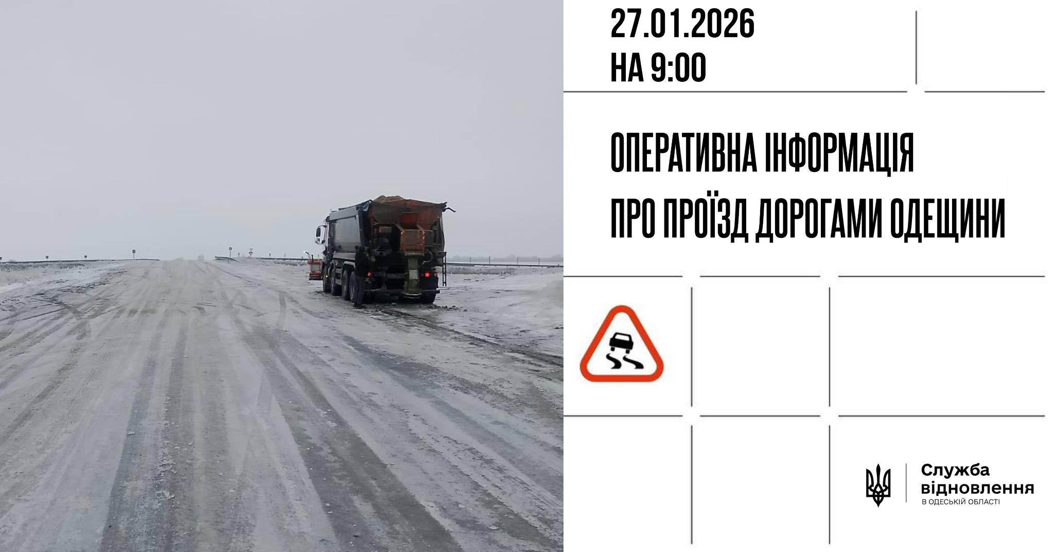 ➡️ Станом на 9:00 годину ранку, 27 січня, проїзд автомобільними дорогами загального користування державного значення Одеської області забезпечено, тільки на автодорозі М–13 Кропивницький – Платонове (на м. Кишинів), км 157+052 – 254+068 зберігається заборона руху для всіх видів транспорту з метою уникнення надзвичайних ситуацій.