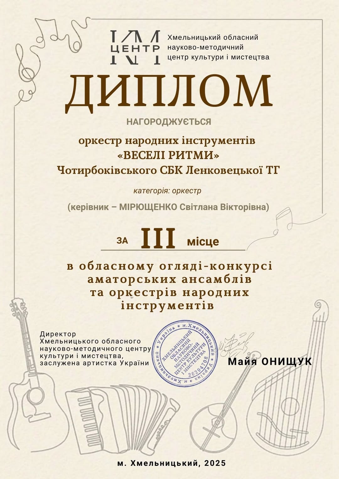 ** Оркестр народних інструментів із гордістю повідомляє про свою першу й одразу успішну участь в обласному огляді-конкурсі аматорських ансамблів та оркестрів народних інструментів, **де здобув** почесне III місце**