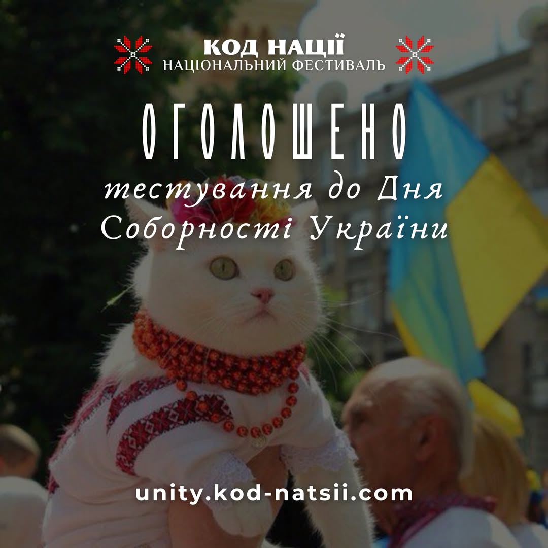 Освітньою платформою Національного Фестивалю “Код Нації”, оголошено про проведення Тестування до Дня Соборності України, який відзначається 22 січня на згадку про проголошення Акта Злуки Української Народної Республіки та Західноукраїнської Народної Республіки у 1919 році, що засвідчило прагнення українського народу до єдності, незалежності та соборності держави.