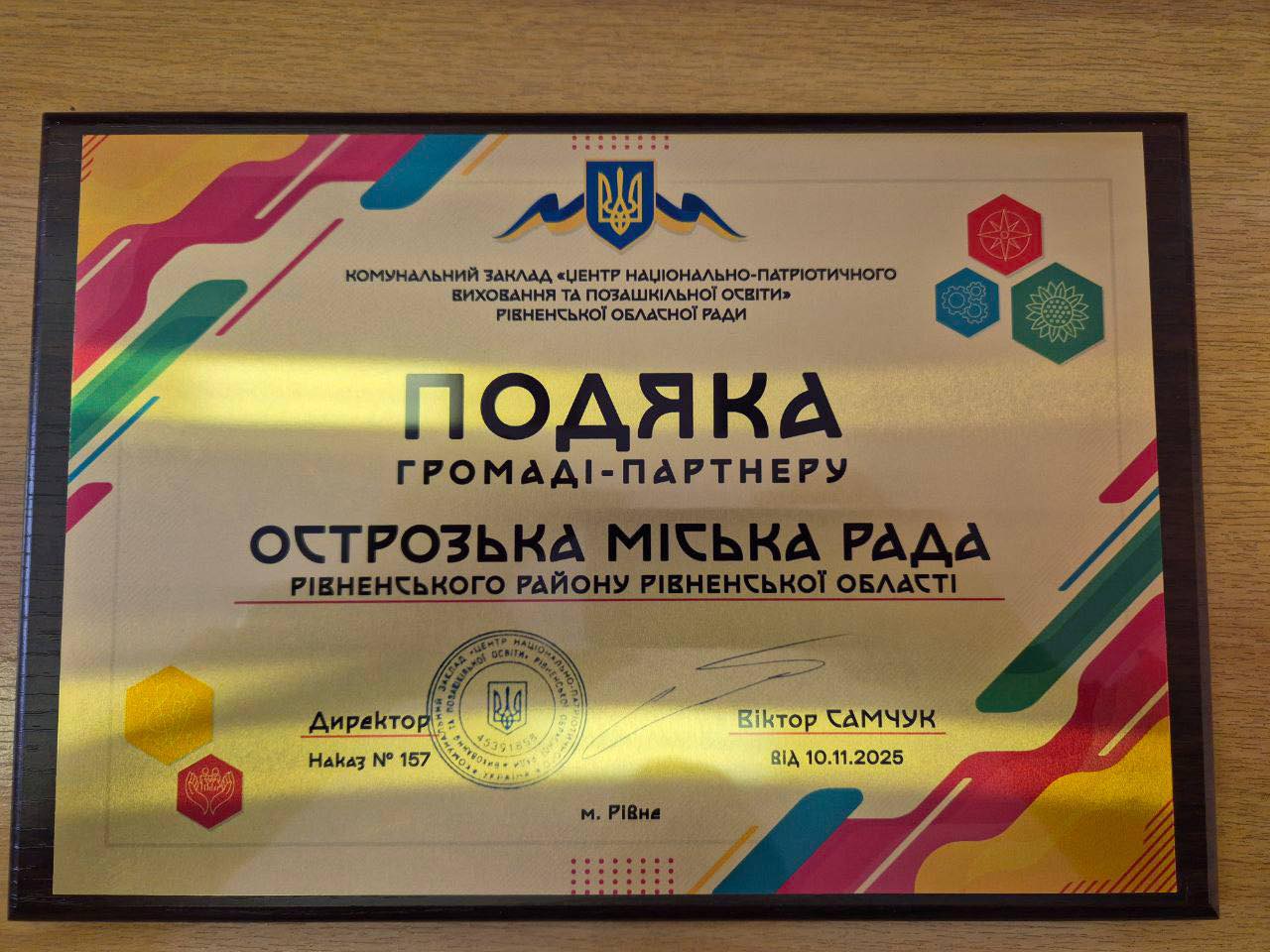 Острозька громада отримала подяку від КЗ «Центр національно-патріотичного виховання та позашкільної освіти» Рівненської обласної ради!