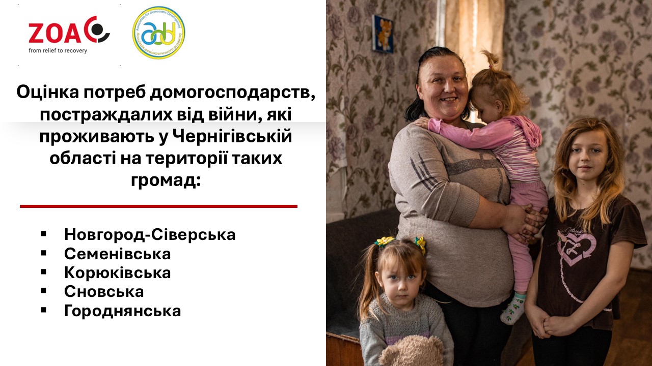 Міжнародна гуманітарна організація ZOA in Ukraine спільно з Association for democratic development/Асоціація демократичного розвитку проводять оцінку потреб домогосподарств у таких громадах Чернігівської області: