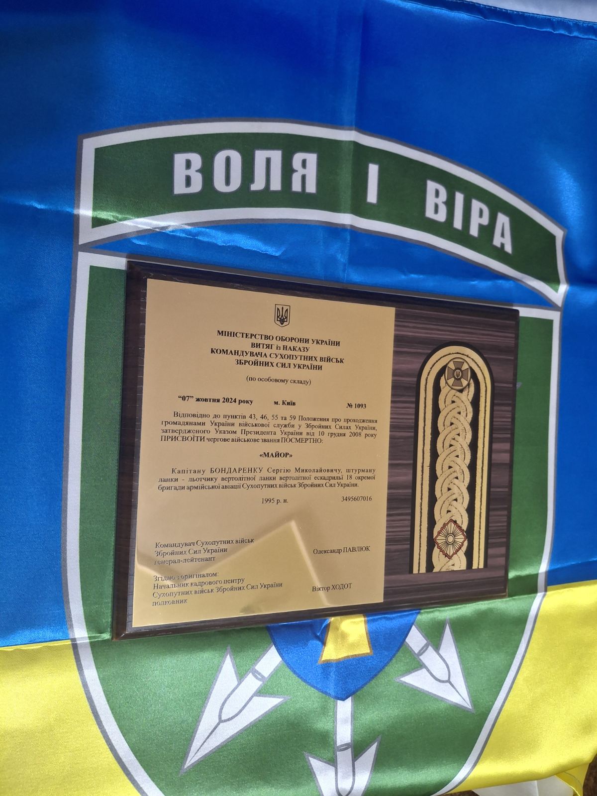 На відкритті були присутні бійці 18 бригади Армійської авіації, у якій служив Сергій Бондаренко. Заступник командира ескадрильї військового формування вручив сім”ї Бондаренків Пам”ятний знак про присвоєння капітану Сергію Бондаренку чергового звання – майор , посмертно.