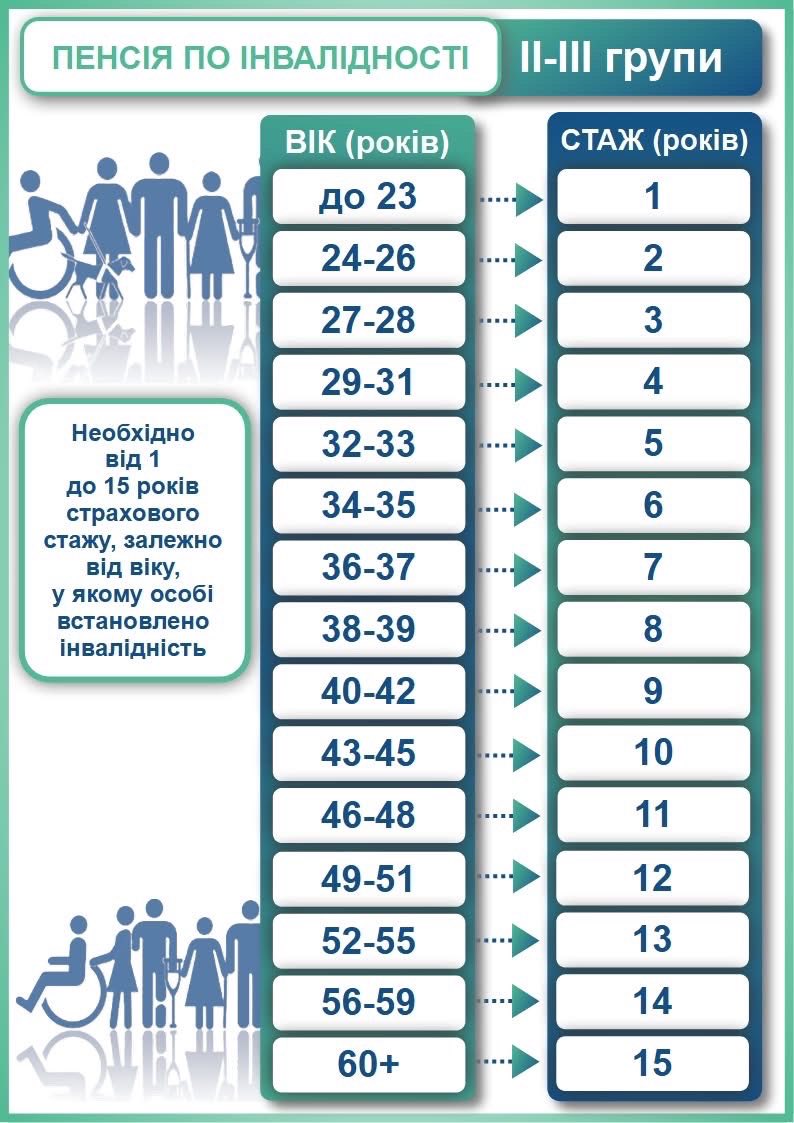 ✅ ДЛЯ ІІ-ІІІ ГРУПИ ІНВАЛІДНОСТІ необхідно від 1 до 15 років страхового стажу, залежно від віку, у якому особі встановлено інвалідність: