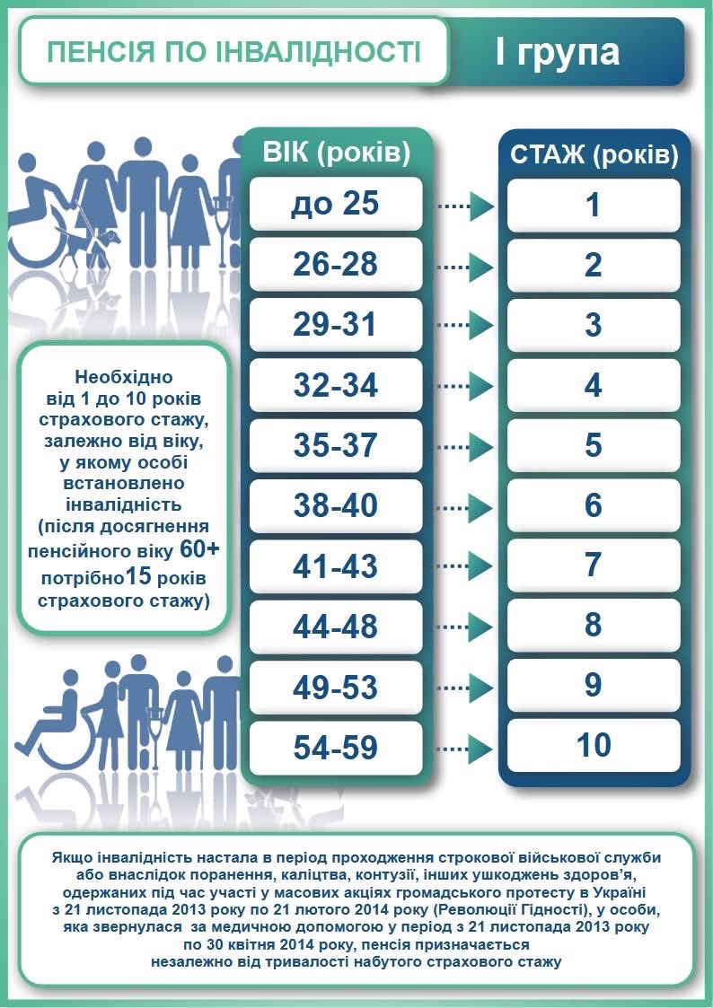 ✅ ДЛЯ І ГРУПИ ІНВАЛІДНОСТІ необхідно від 1 до 10 років страхового стажу, залежно від віку, у якому особі встановлено інвалідність: