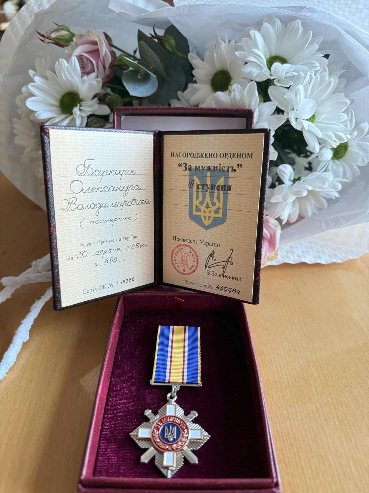 Відповідно до Указу Президента України від 30 серпня 2025 року №668 за особисту мужність, відвагу, самопожертву та героїзм, виявлені під час захисту України військовослужбовця Збройних Сил України Олександра БАРКАРА нагороджено орденом “За мужність” ІІІ ступеня (посмертно).