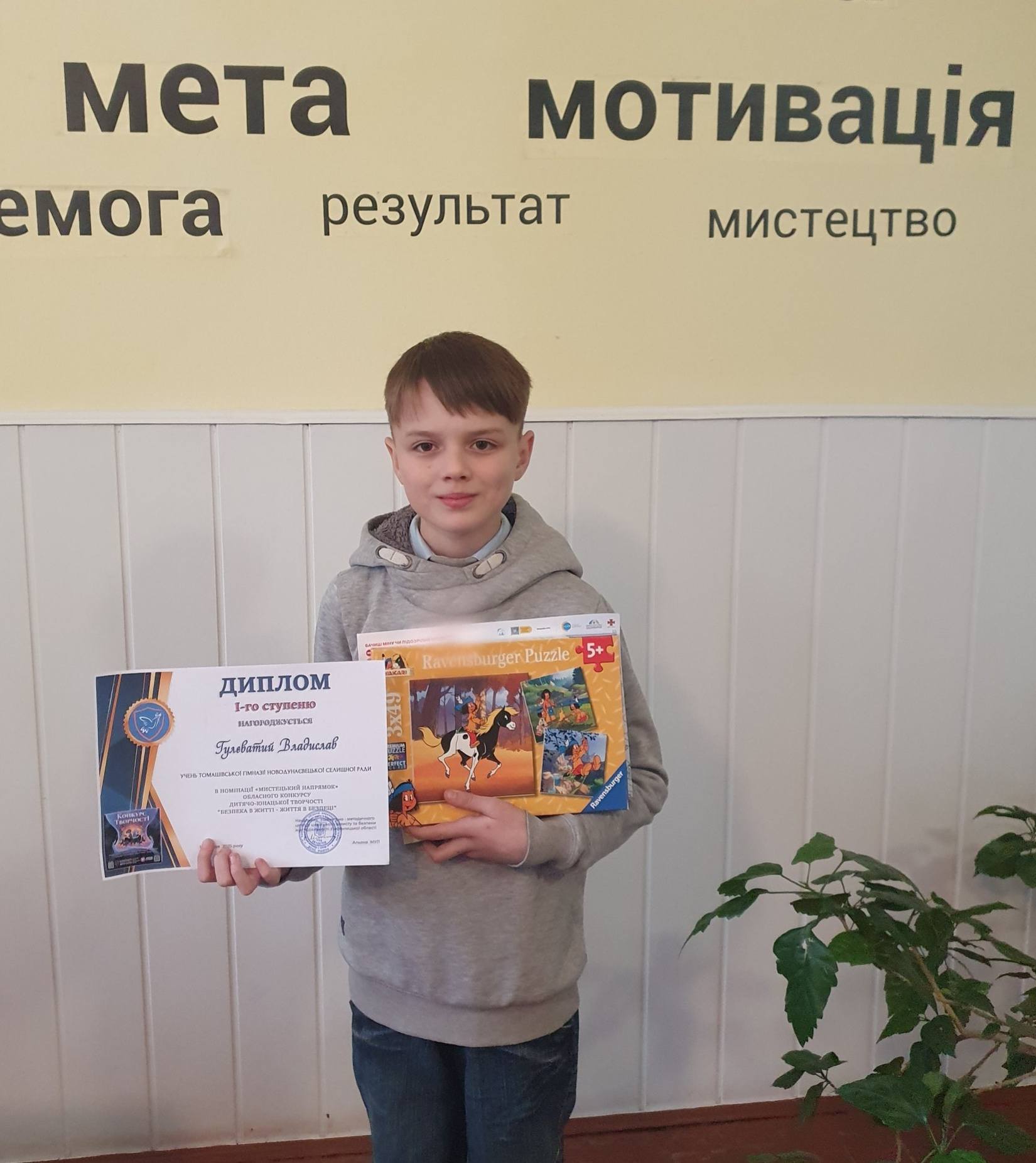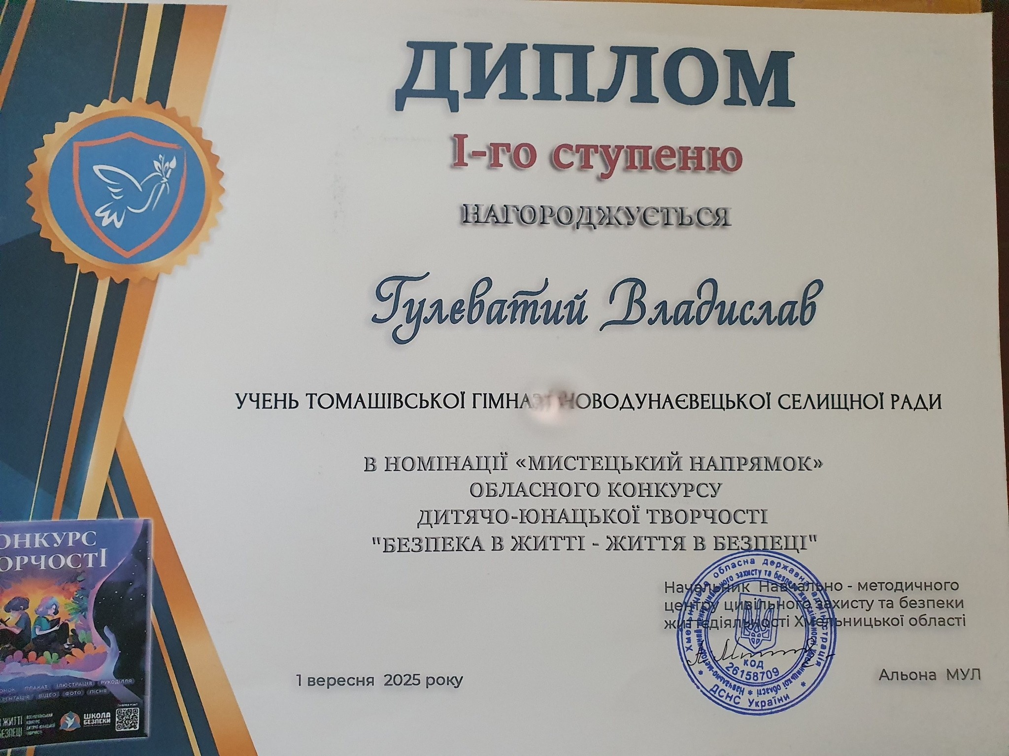 Здобувач освіти 6 класу Томашівська гімназія ГУЛЕВАТИЙ ВЛАДИСЛАВ АНДРІЙОВИЧ в черговий раз здобув диплом І ступеня в обласному конкурсі ” Безпека в житті – життя в безпеці” в номінації “Мистецький напрямок” ( керівник Власюк М.В.).