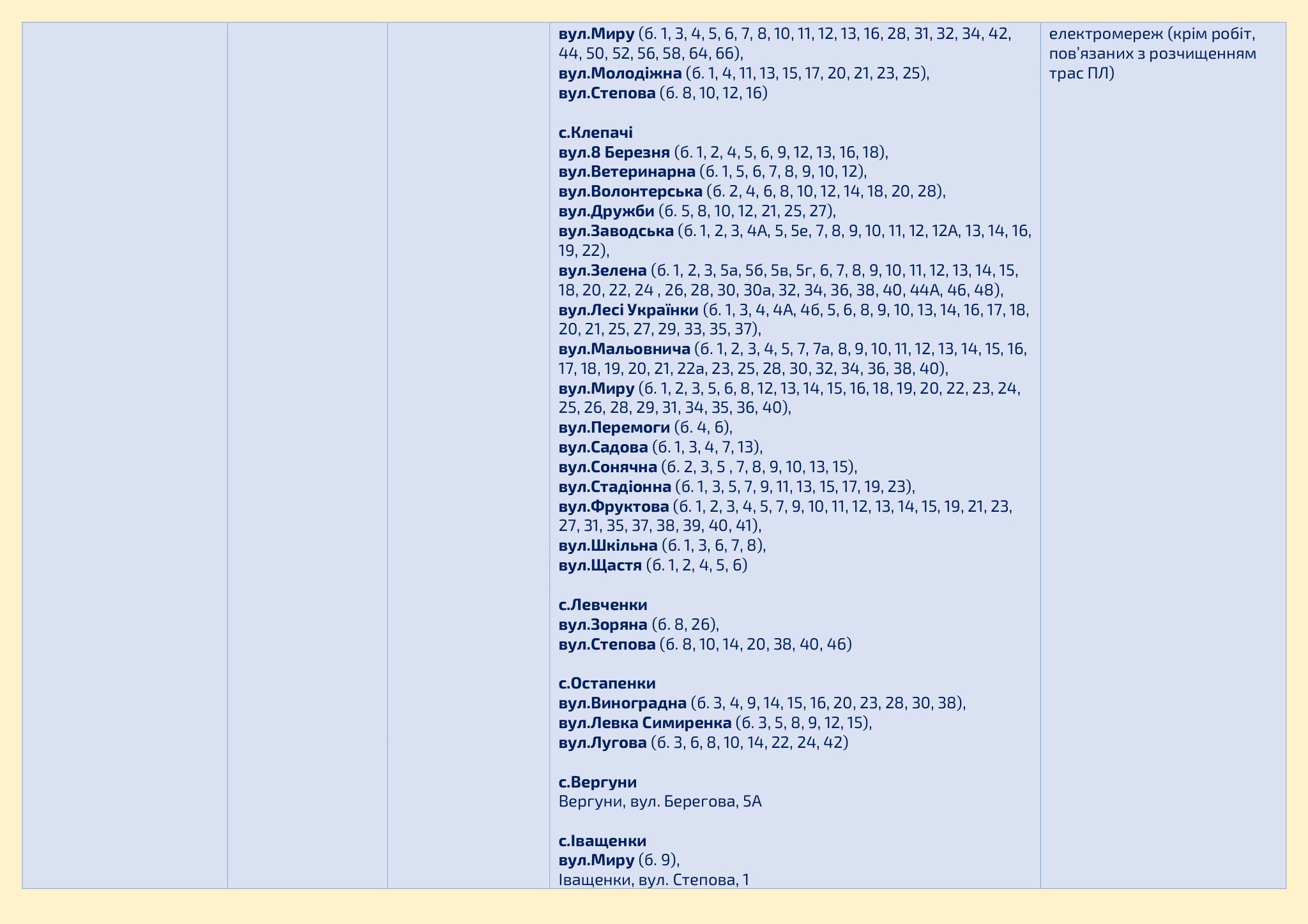 У зв’язку із проведенням робіт у мережах АТ «ПОЛТАВАОБЛЕНЕРГО» можливі тимчасові перерви в електропостачанні споживачів. Дата, орієнтовний час початку та закінчення перерви вказані у таблиці.