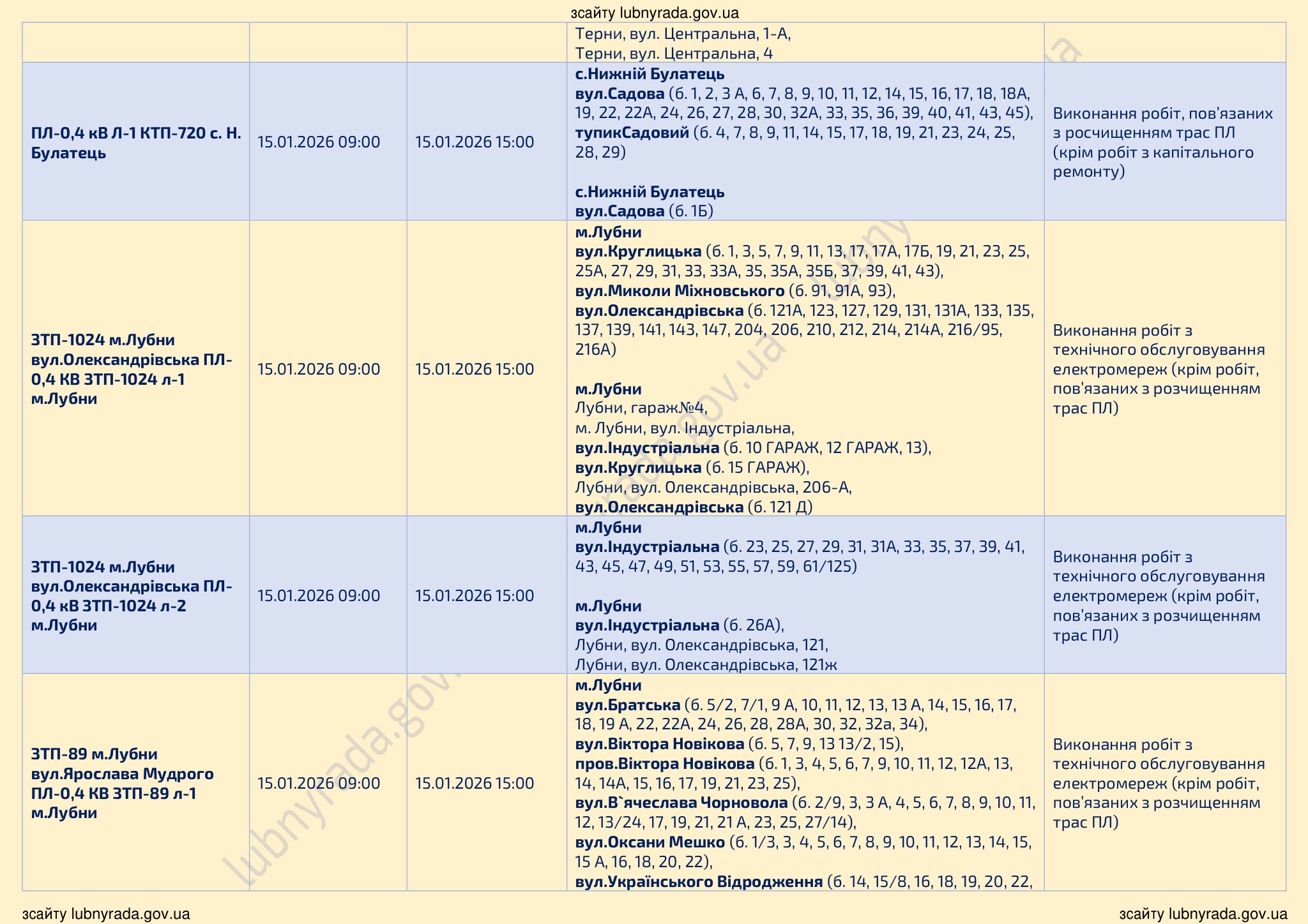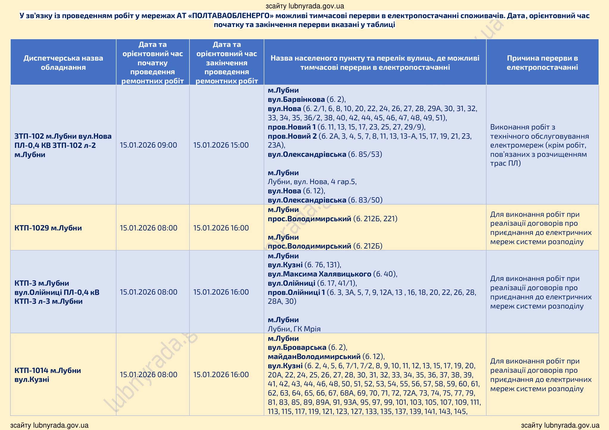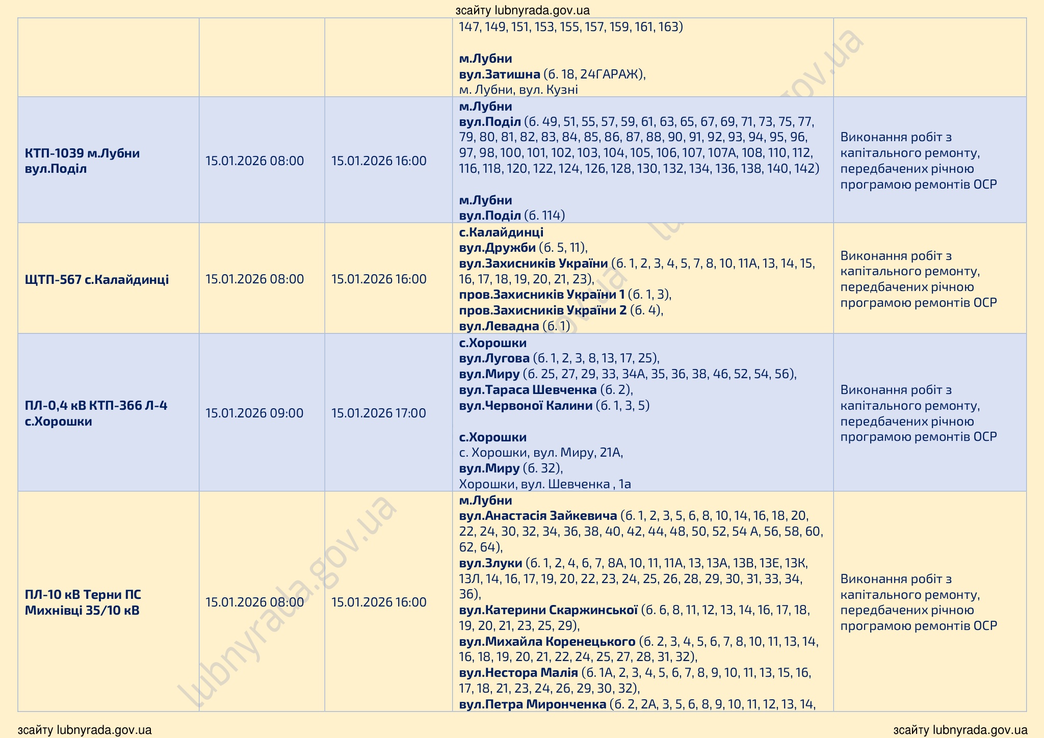 💡ПЛАНОВІ ВІДКЛЮЧЕННЯ ЕЛЕКТРОЕНЕРГІЇ НА 15.01.2026💡🔌