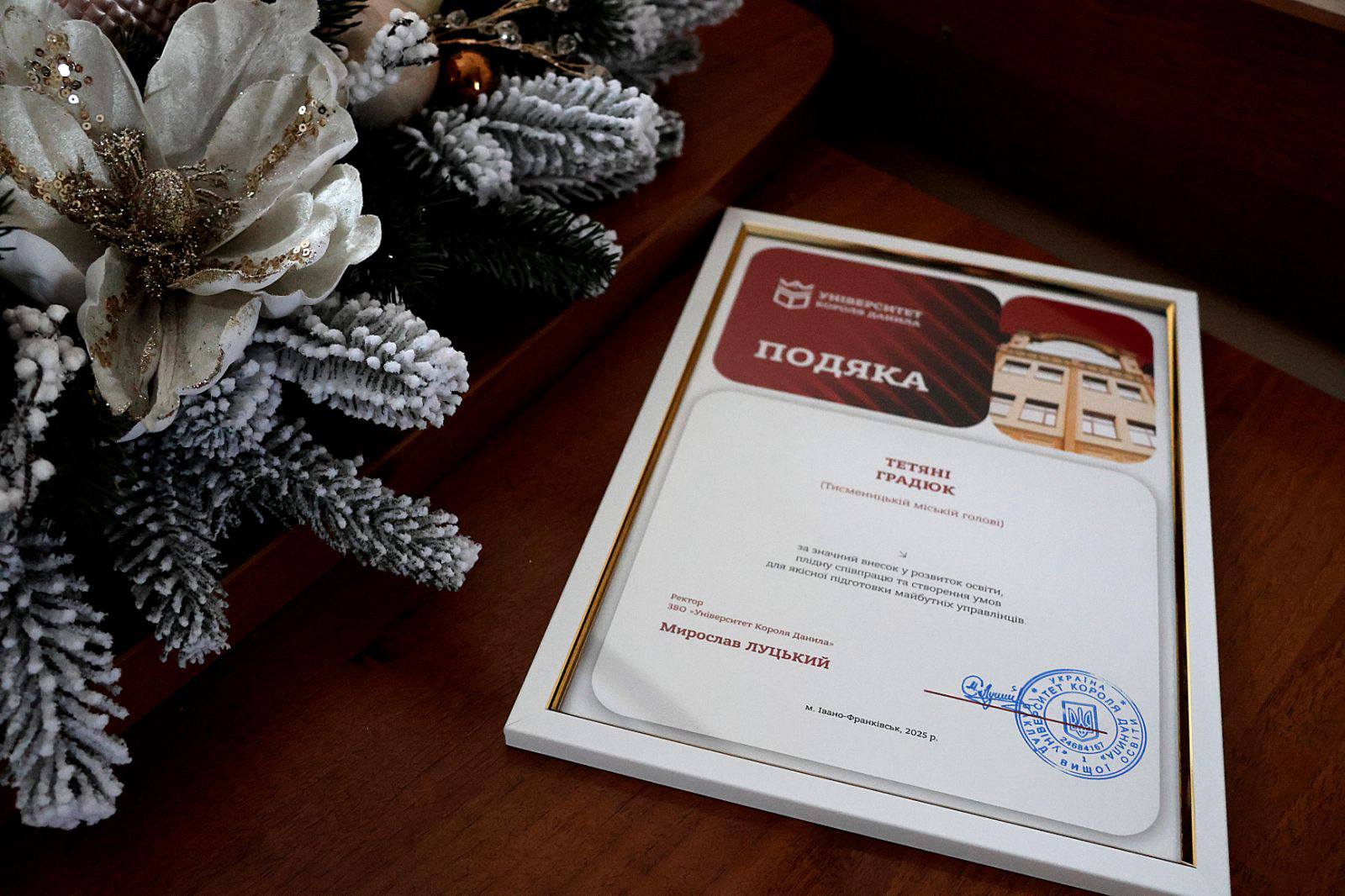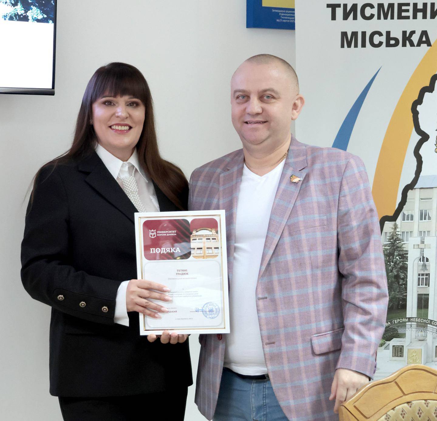 З нагоди Дня місцевого самоврядування міський голова Тетяна Градюк отримала подяку від Університету Короля Данила. Нагороду вручив Олександр Загурський, член виконавчого комітету Тисменицької міської ради, доцент кафедри права імені академіка УАН о. Івана Луцького, кандидат юридичних наук.