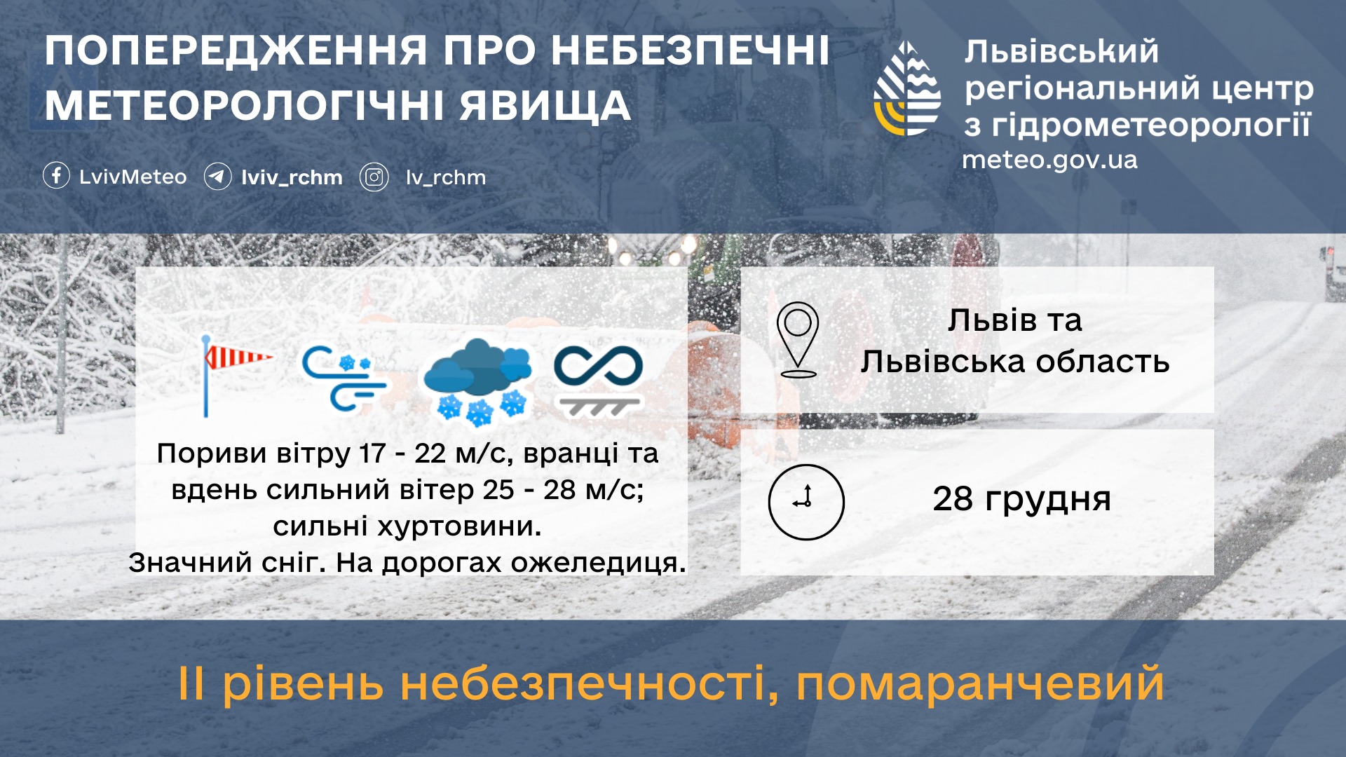 28 грудня пориви північно-західного вітру 17 – 22 м/с, вранці та вдень сильний вітер 25 – 28 м/с; сильні хуртовини. Місцями значний сніг. На дорогах ожеледиця.