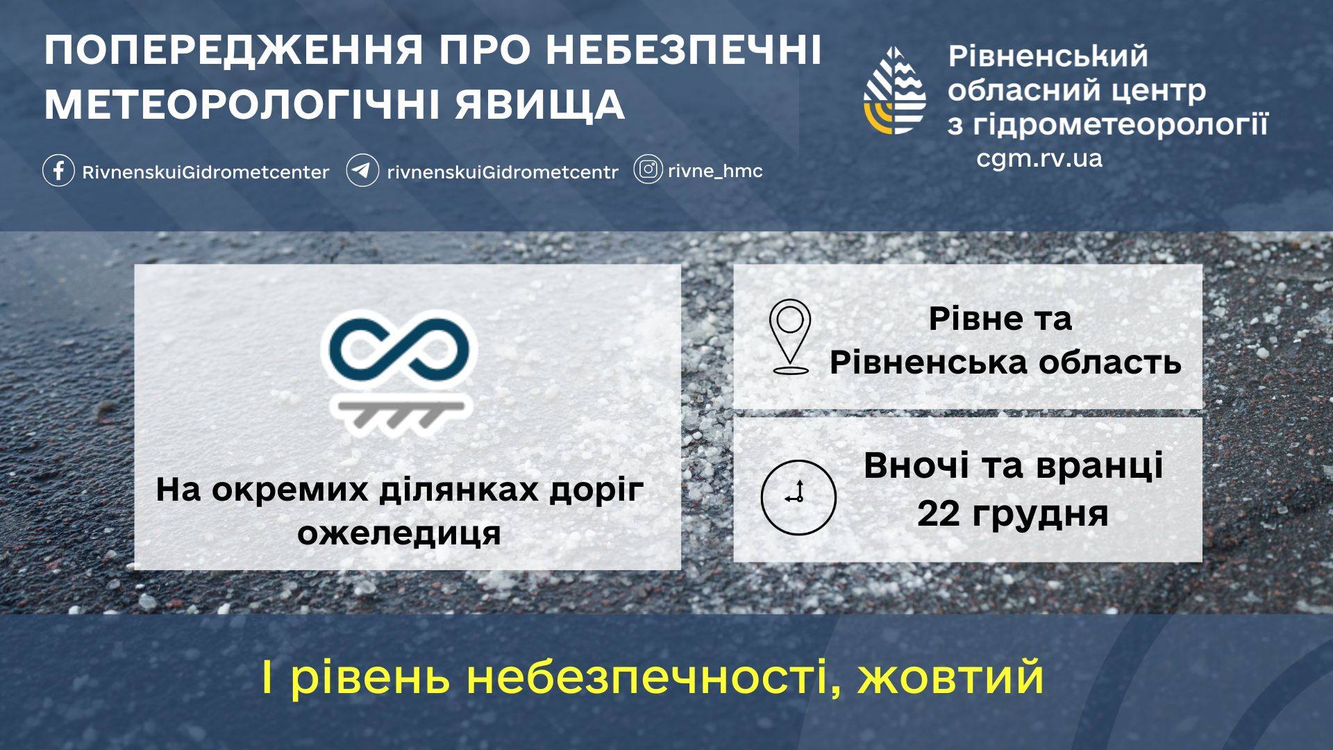 Сьогодні 2⃣1⃣ грудня ввечері, а також вночі та вранці 2⃣2⃣ грудня, по м. Рівне та Рівненській області очікується туман 200-500 м, на окремих ділянках доріг ожеледиця!
