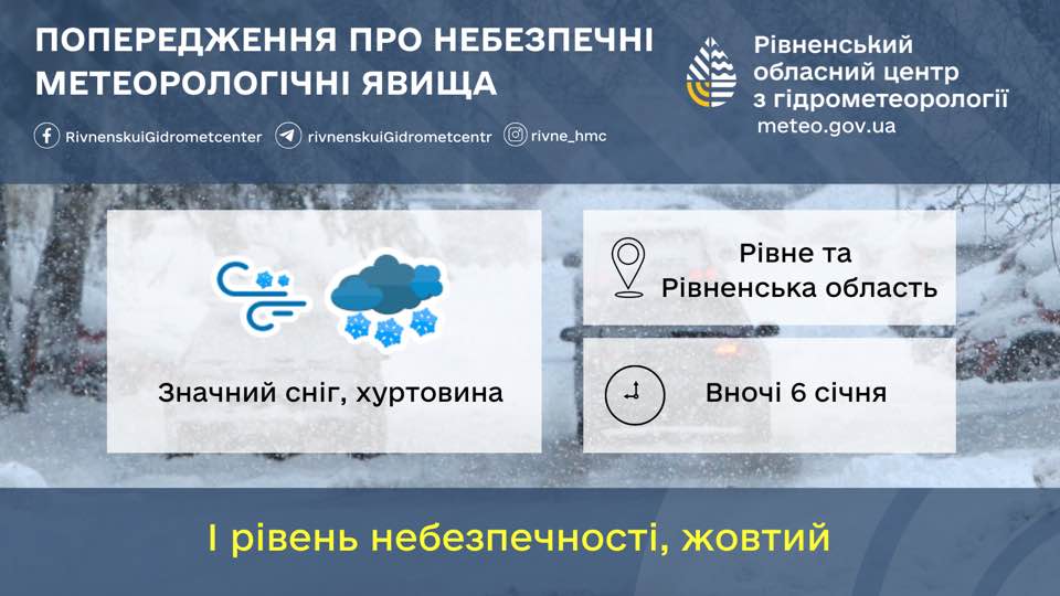 Вночі 6️⃣ січня по м. Рівне та Рівненській області значний сніг, хуртовина. Протягом доби на дорогах ожеледиця!