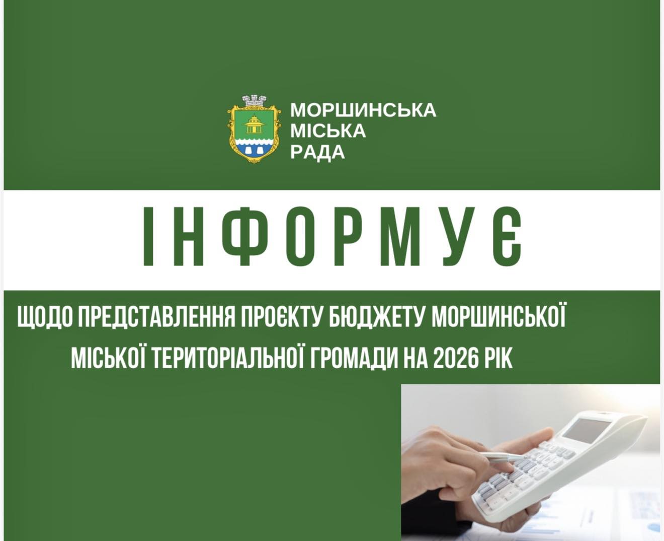 15 грудня 2025 року о 17:00 у залі засідань Моршинської міської ради (вул. І. Франка, 15) відбудеться публічне представлення проєкту бюджету Моршинської міської територіальної громади на 2026 рік.