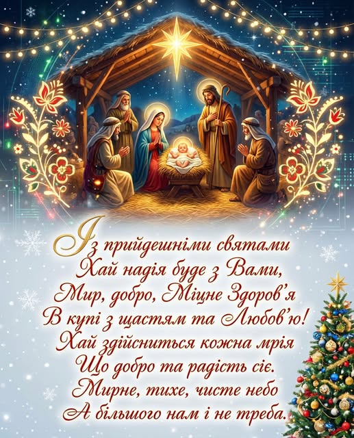 Нехай тепло Різдвяного вогню зігріває любов’ю наші серця протягом усього року, а світло Різдвяної зірки осяє кожного і зійде Божа благодать з благословенням миру. Нехай здійсняться заповітні бажання та мрії, а життєва нива з року в рік засівається зернами миру і добра, щастя та благополуччя. Хай щедра доля наділить нас міцним здоров’ям і злагодою в родинах і суспільстві!