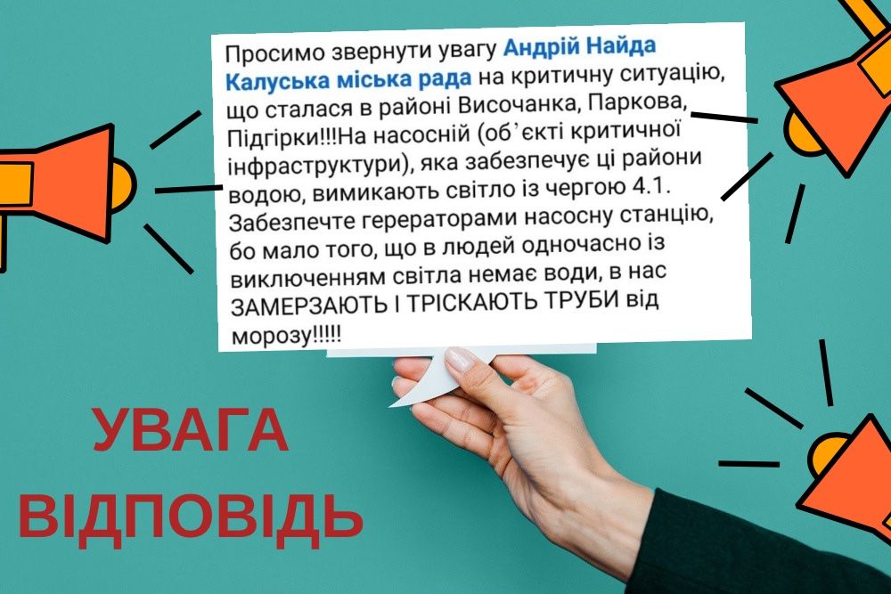 Як повідомили в КП «Калуська енергетична компанія» – підкачувальна насосна станція, яка забезпечує водопостачання мікрорайонів Височанка та Підгірки, належить до об’єктів критичної інфраструктури. Водночас під час планових відключень електроенергії станція також знеструмлюється, у зв’язку з чим підприємством використовується резервний генератор.