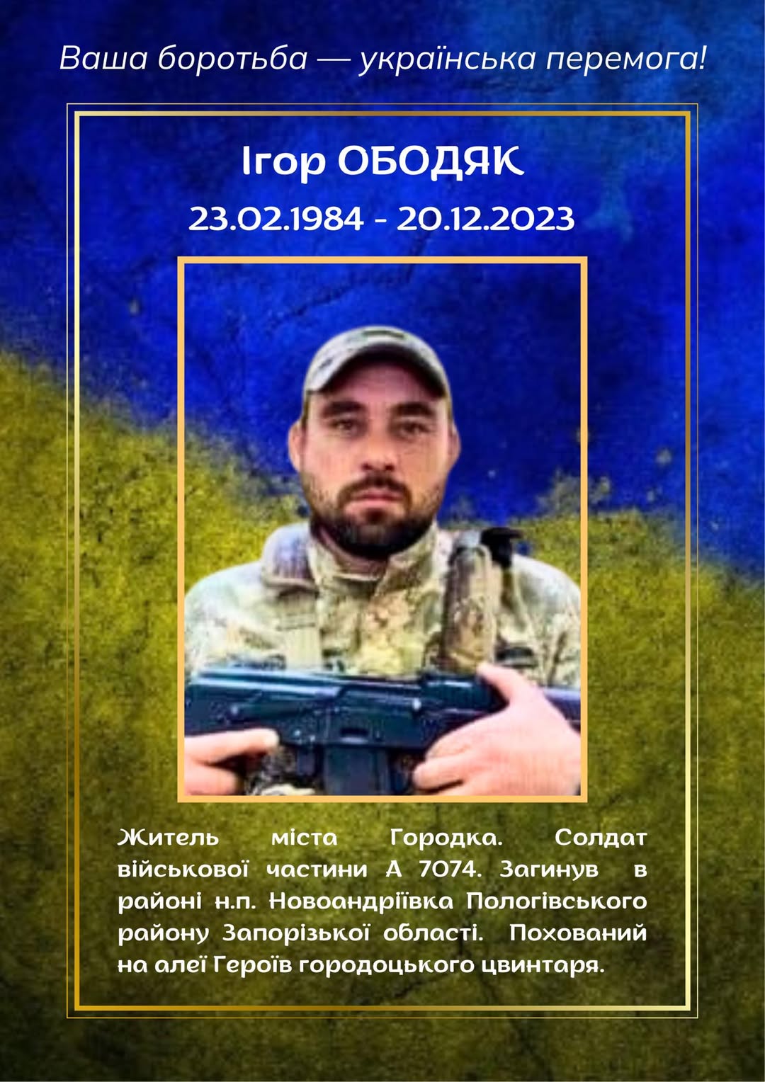 Вшановуємо у ці дні другі роковини загибелі городківчанина, солдата в/ч А7074 ОБОДЯКА Ігоря Романовича.