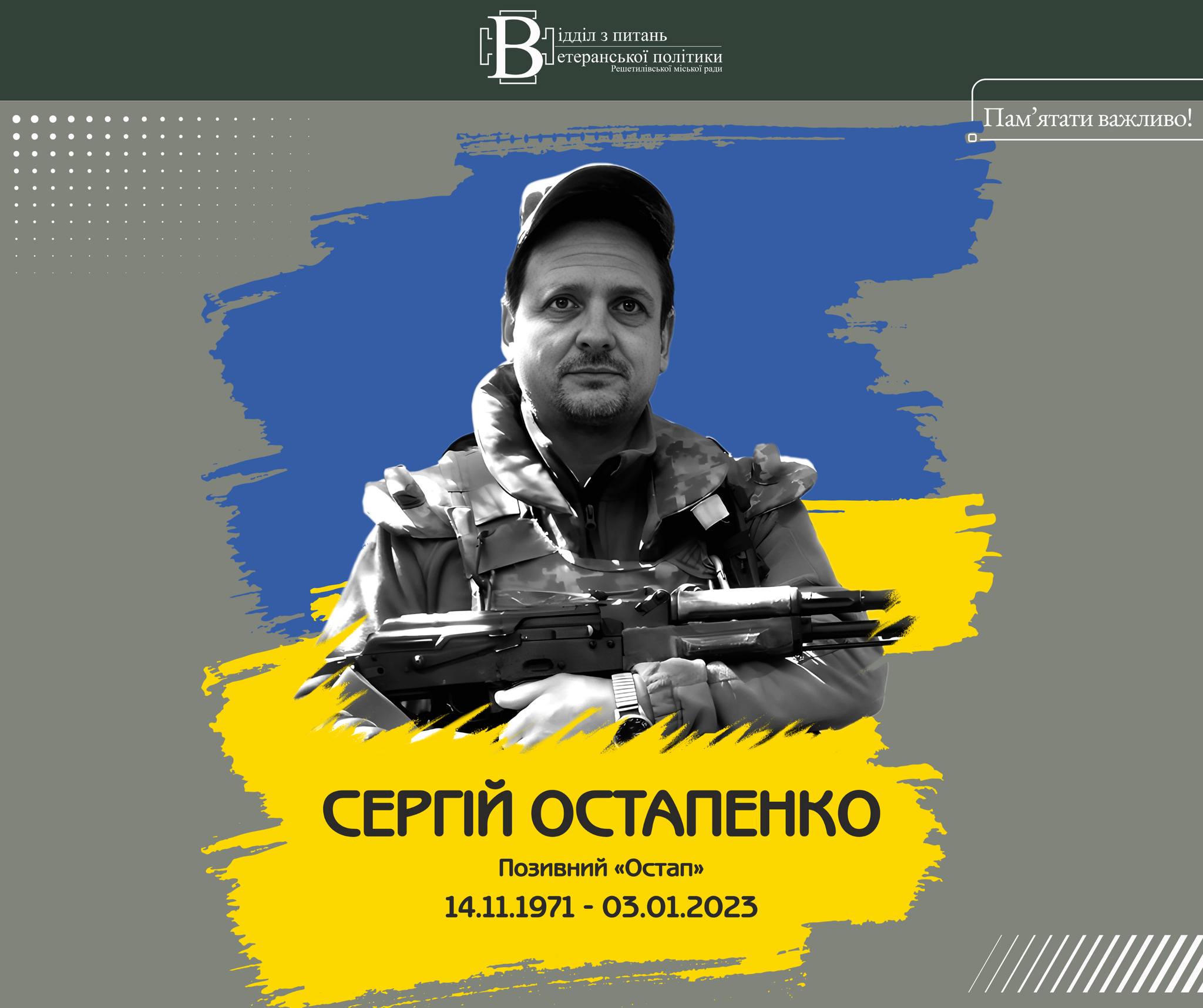 Вірний військовій присязі та громадському обов’язку старший сержант ОСТАПЕНКО Сергій 61-ї ОМБр проявив мужність, патріотизм і любов до України, помер за свободу та незалежність Української Держави 03 січня 2023 року в районі н.п. Соледар Бахмутського району Донецької області у віці 51 рік…