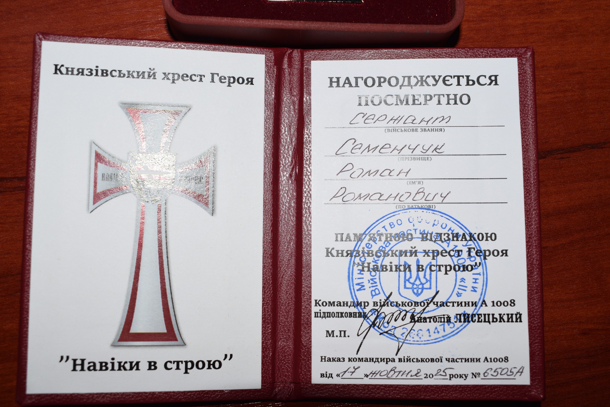 🇺🇦 Сержант Семенчук Роман Романович був посмертно нагороджений пам’ятною відзнакою “Князівський хрест Героя «Навіки в Строю»” (наказ військової частини від 17.10.2025 року №6505А, за підписом підполковника Анатолія Лисецького).