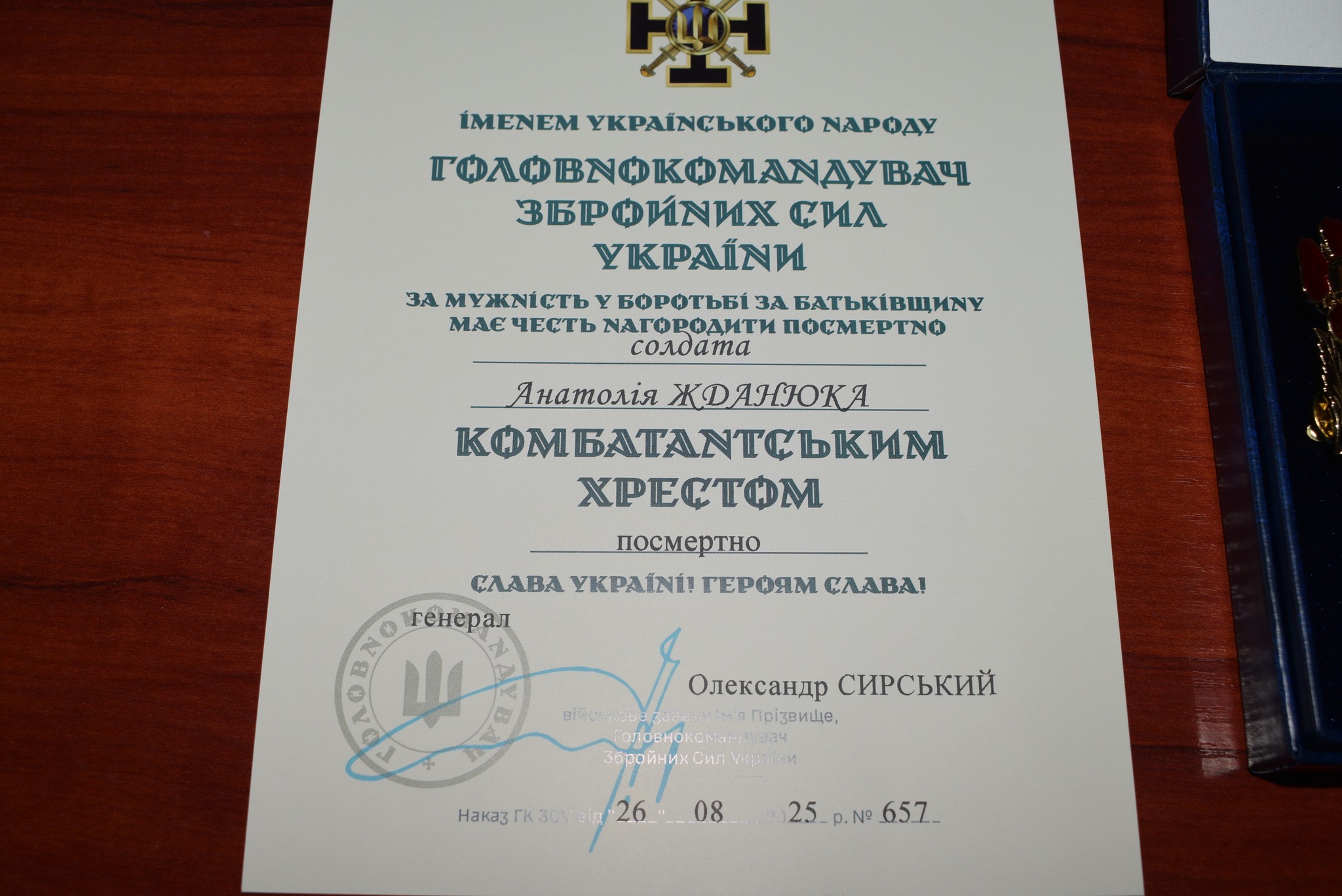 🇺🇦 Солдат Анатолій Жданюк був нагороджений Комбатським Хрестом (наказ від 26.08.2025 №657, за підписом Головнокомандувача Збройних Сил України Олександра Сирського).