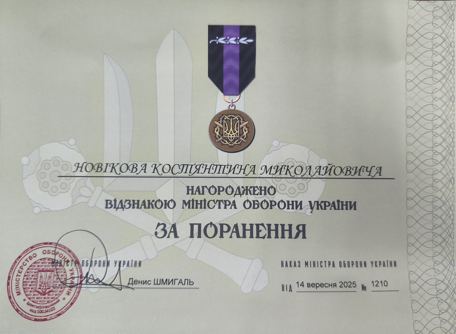 **Новікова Костянтина Миколайовича** нагороджено відзнакою **Міністра оборони України** за поранення, отримане під час виконання бойових завдань із захисту України.