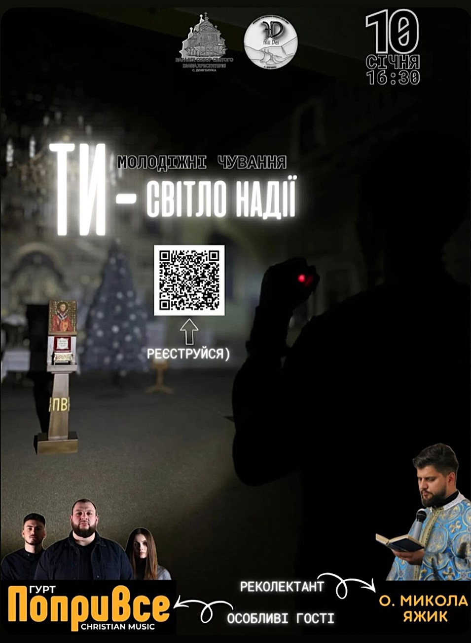 10 січня, 16:30 год – молодіжні чування «Ти – світло надії». Реколектант – о. Микола Яжик, особливі гості – музичний християнський гурт PopryVse.