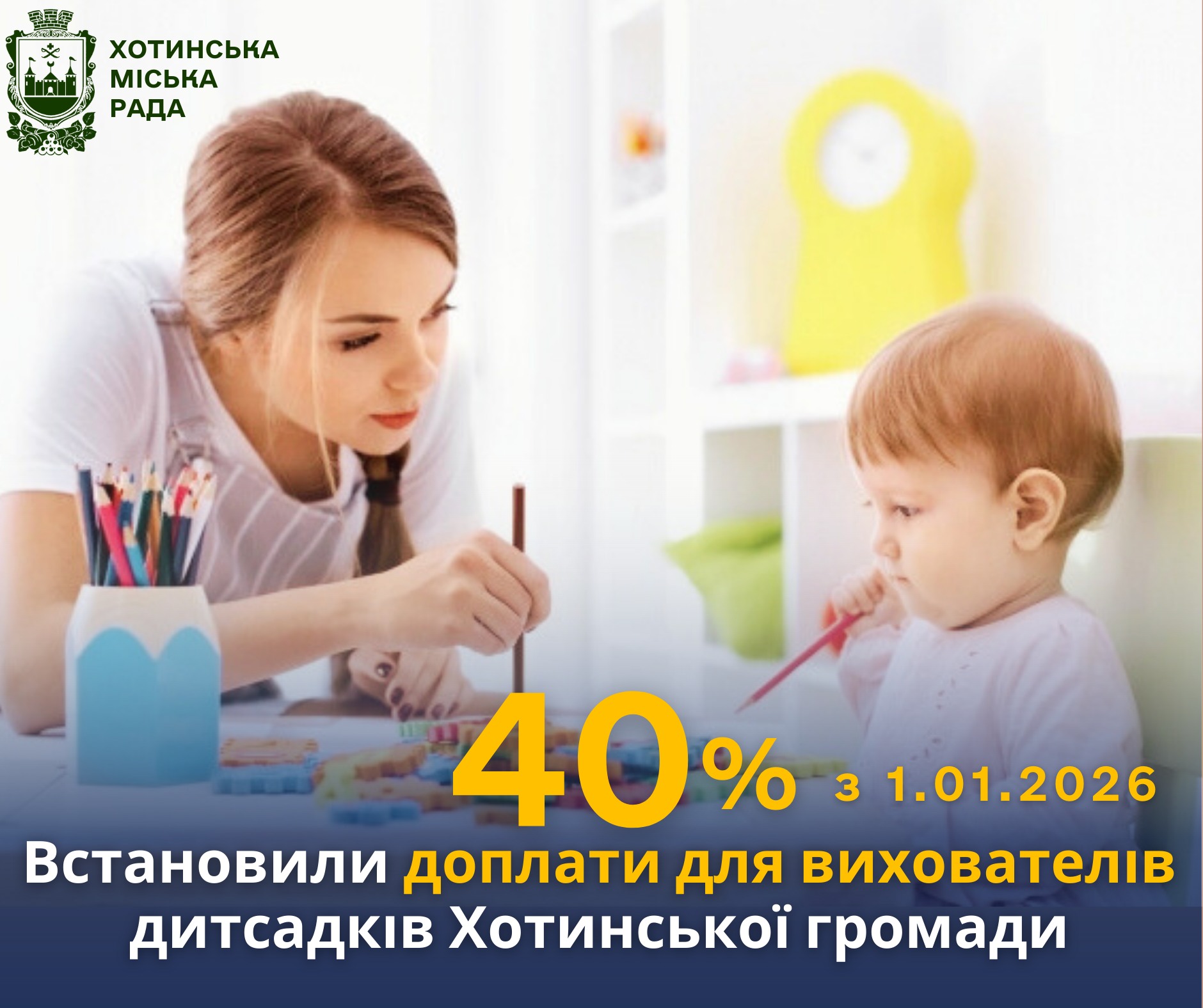 ❗️Маємо дуже важливу і гарну новину: із січня 2026 року підвищуємо посадові оклади на 40% педагогічним працівникам закладів дошкільної освіти Хотинської громади.
