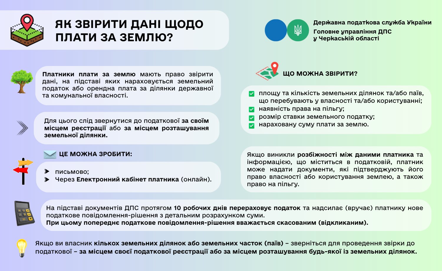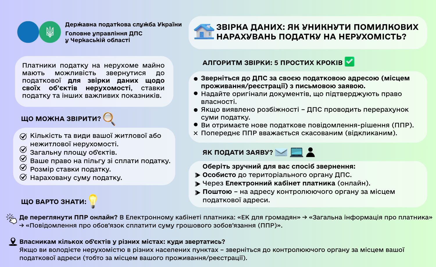 Якщо ви виявили неточності або не згодні з нарахованою сумою, ви маєте право звернутися до податкового органу (письмово або через Електронний кабінет платника) для проведення звірки щодо: