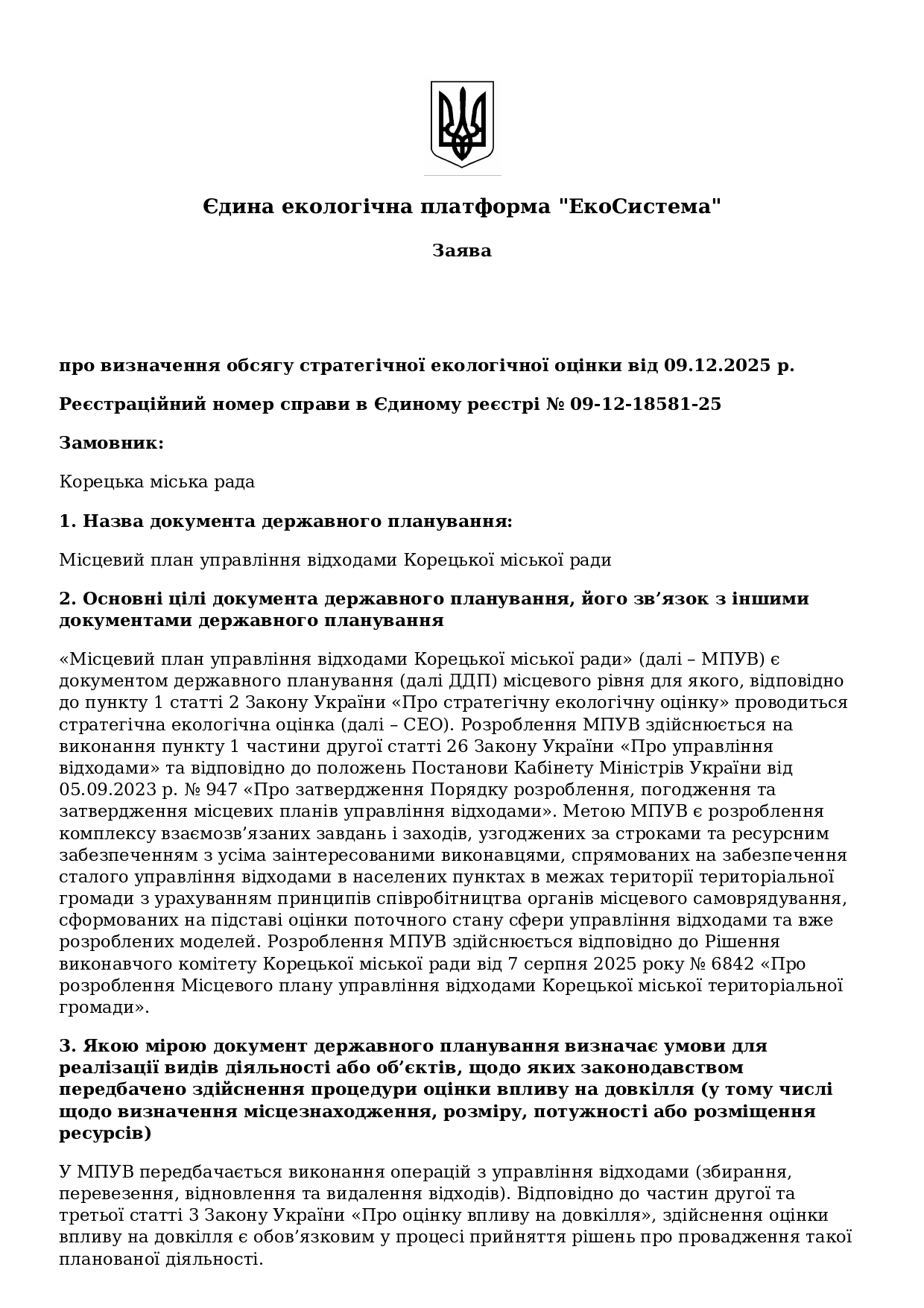 «Місцевий план управління відходами Корецької міської ради» (далі – МПУВ) є документом державного планування (далі ДДП) місцевого рівня для якого, відповідно до пункту 1 статті 2 Закону України «Про стратегічну екологічну оцінку» проводиться стратегічна екологічна оцінка (далі – СЕО).
