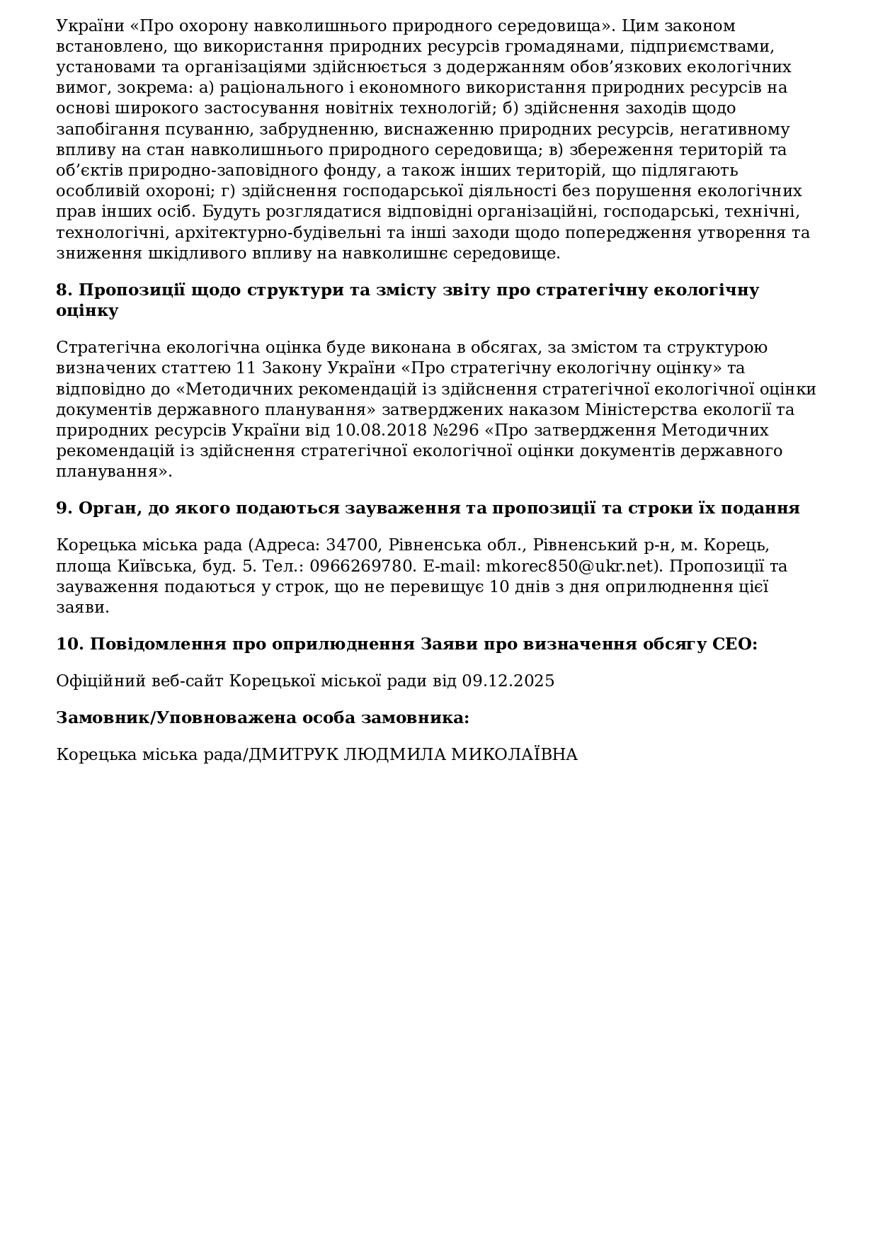 Корецька міська рада (Адреса: 34700, Рівненська обл., Рівненський р-н, м. Корець, площа Київська, буд. 5. Тел.: 0966269780. E-mail: [email protected]).